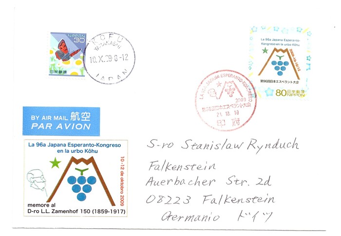 2009年日本寄给Stanislaw的第96届日本世界语大会的纪念封