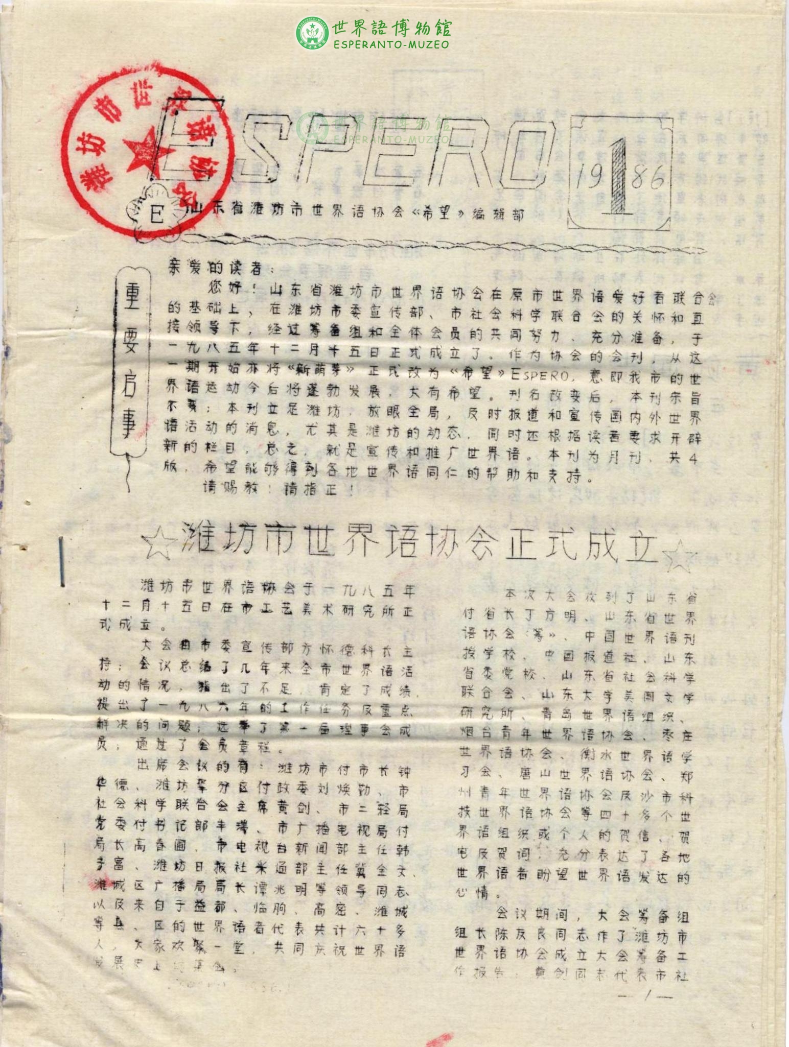 1986年第1期潍坊世界语协会《希望》