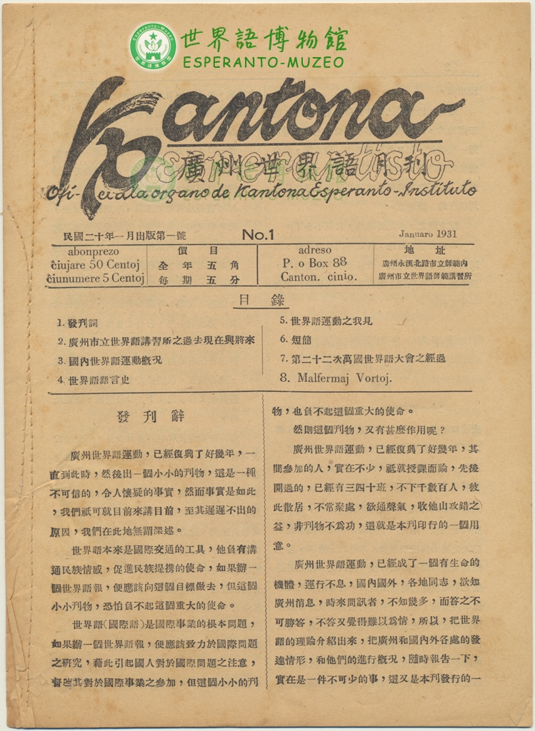 1931年《广州世界语月刊》创刊号