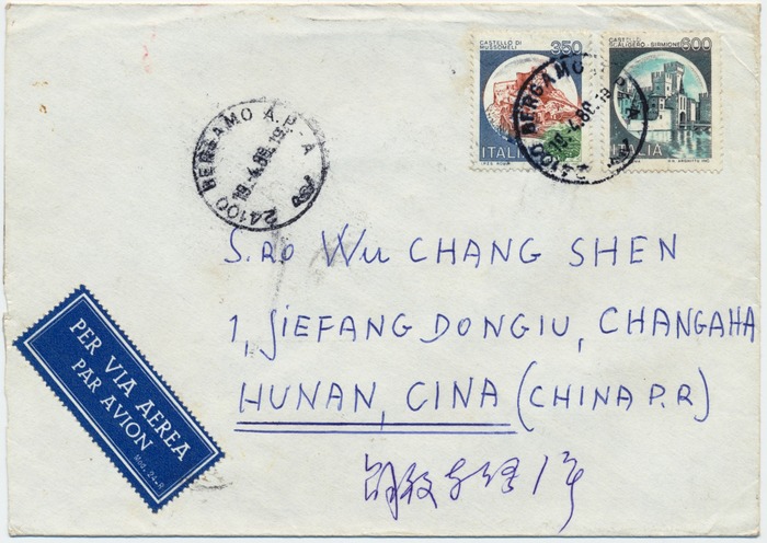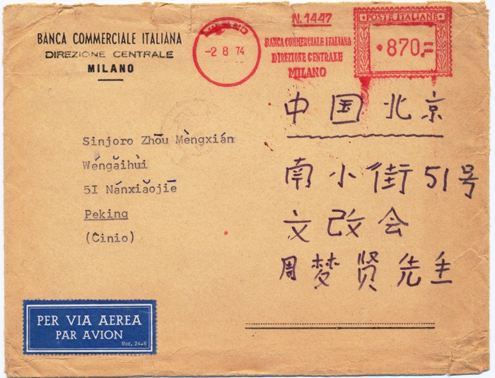 1974年8月2日意大利世界语者致信周梦贤的信封