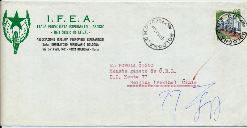 1987年11月9日意大利铁路员工世界语协会致函《中国报道》社的信封