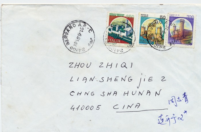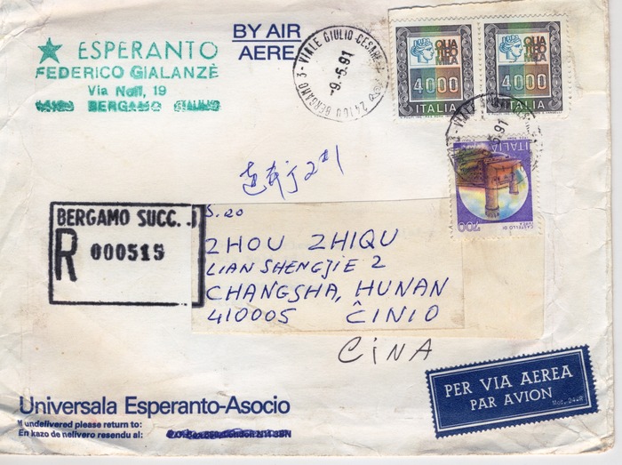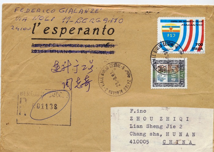 1991年5月31日意大利世界语者致信周志奇所使用的信封