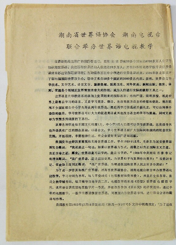 1989年12月湖南省世界语协会 湖南电视台关于“联合举办世界语电视教学”的资料