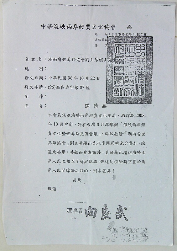 2007年10月22日中华海峡两岸经贸文化协会致刘铁山的函(复印))