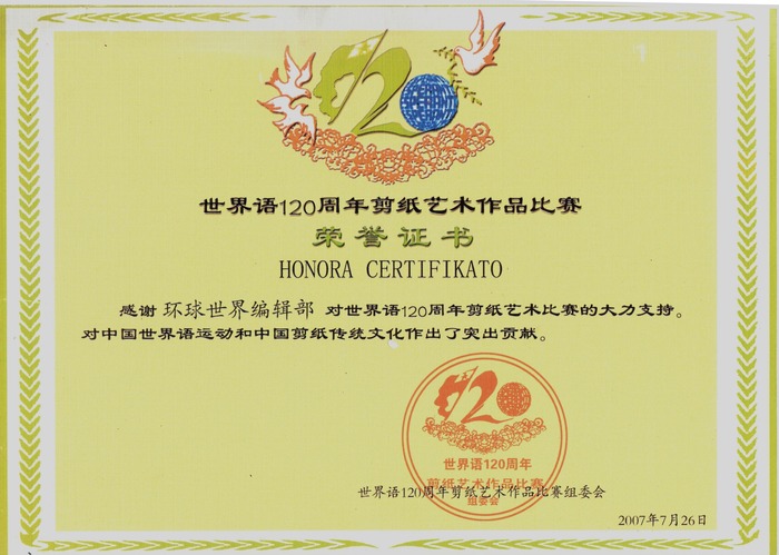 世界语诞生120周年剪纸艺术作品比赛荣誉证书