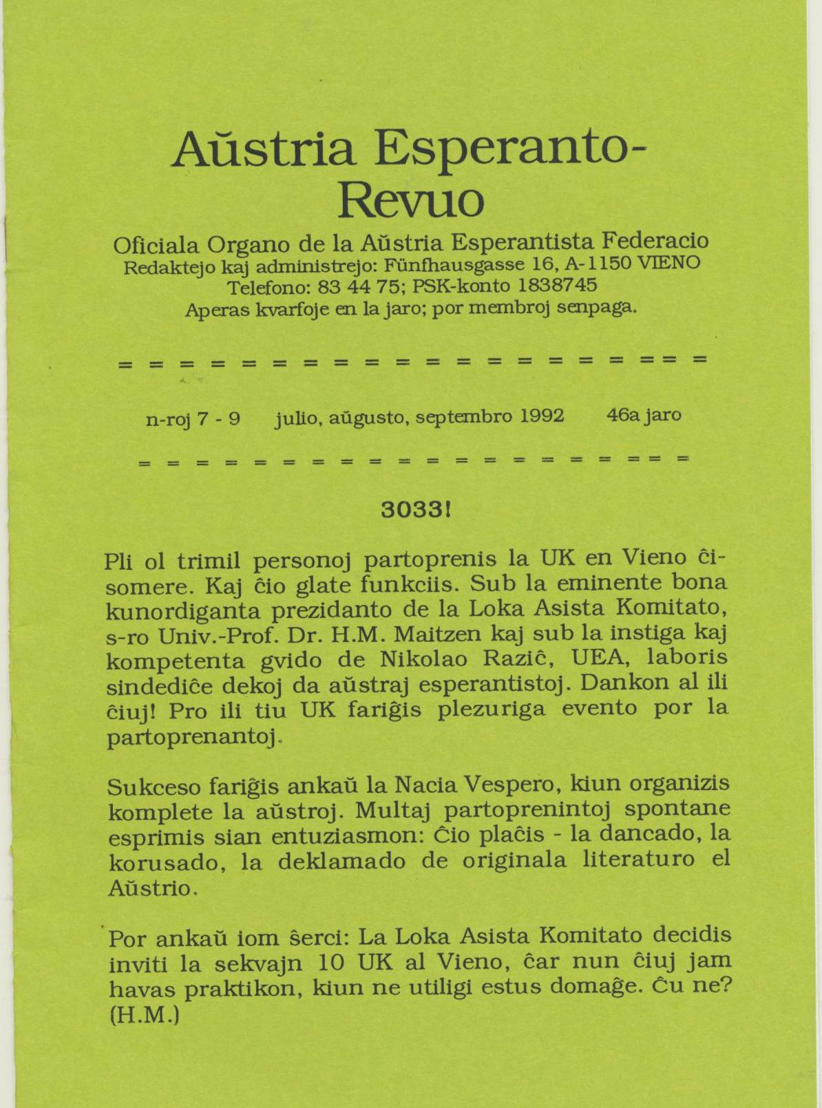 1992年《Austria Esperanto-Revuo》第7-9期