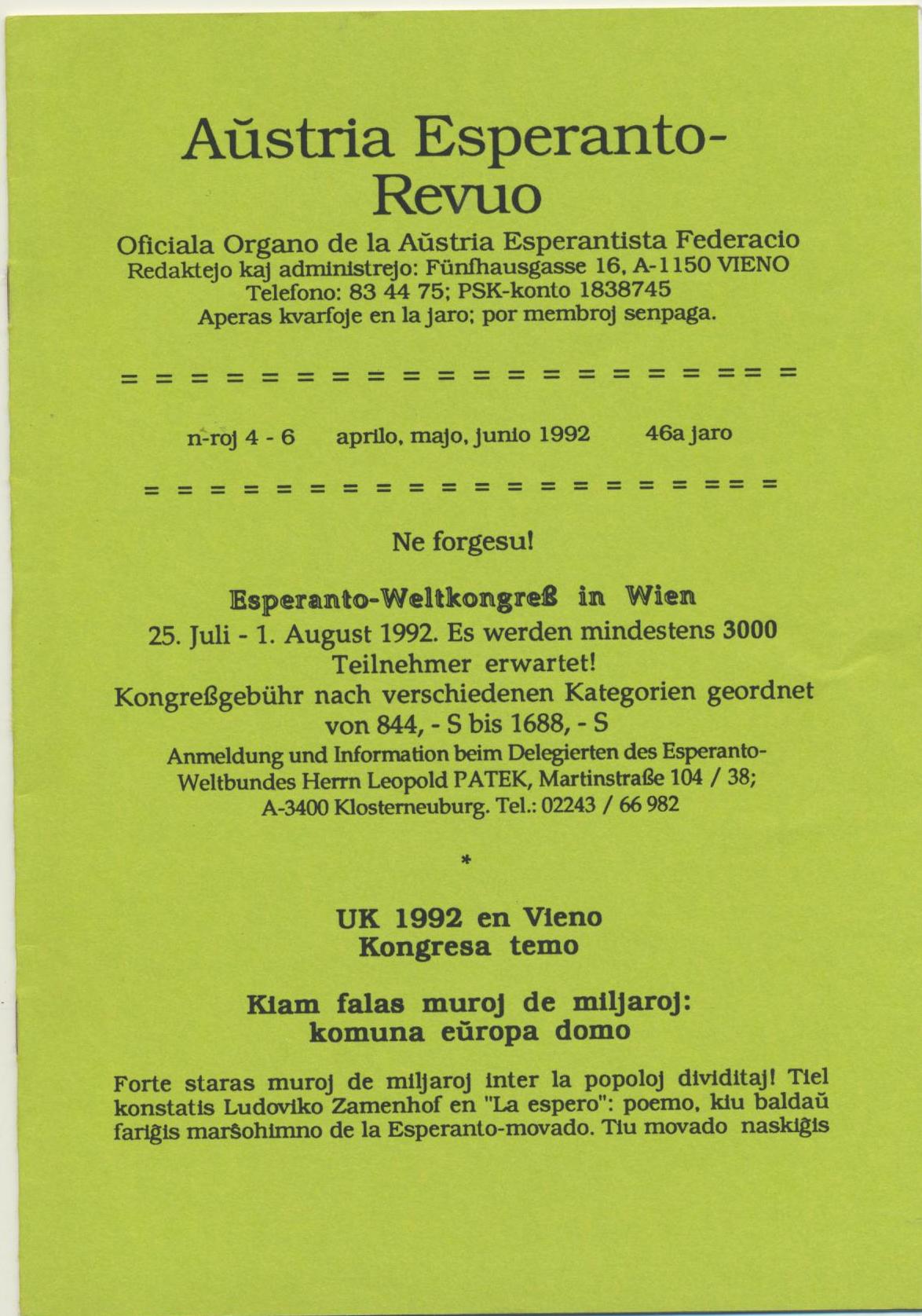 1992年《Austria Esperanto-Revuo》第4-6期
