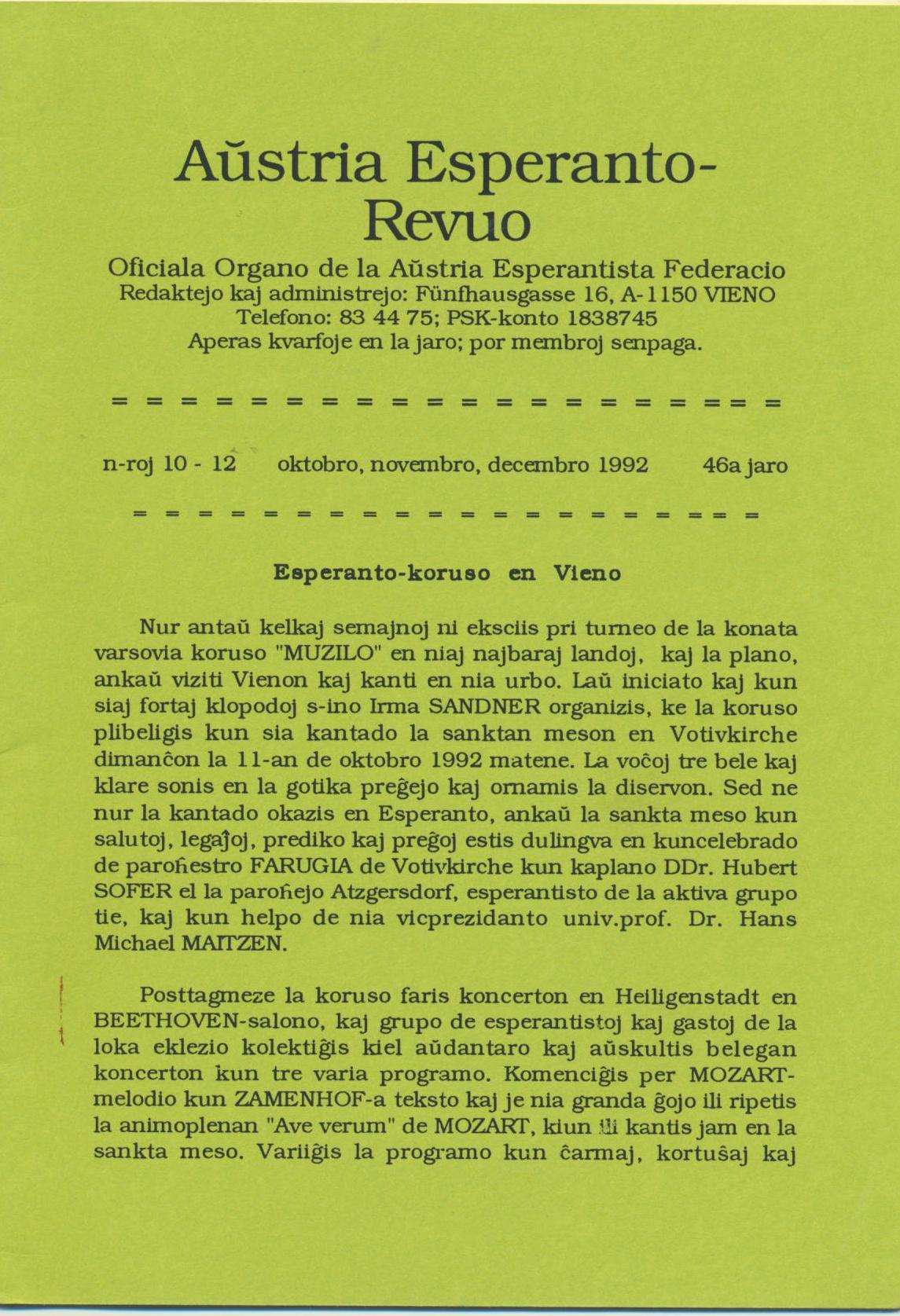 1992年《Austria Esperanto-Revuo》第10-12期