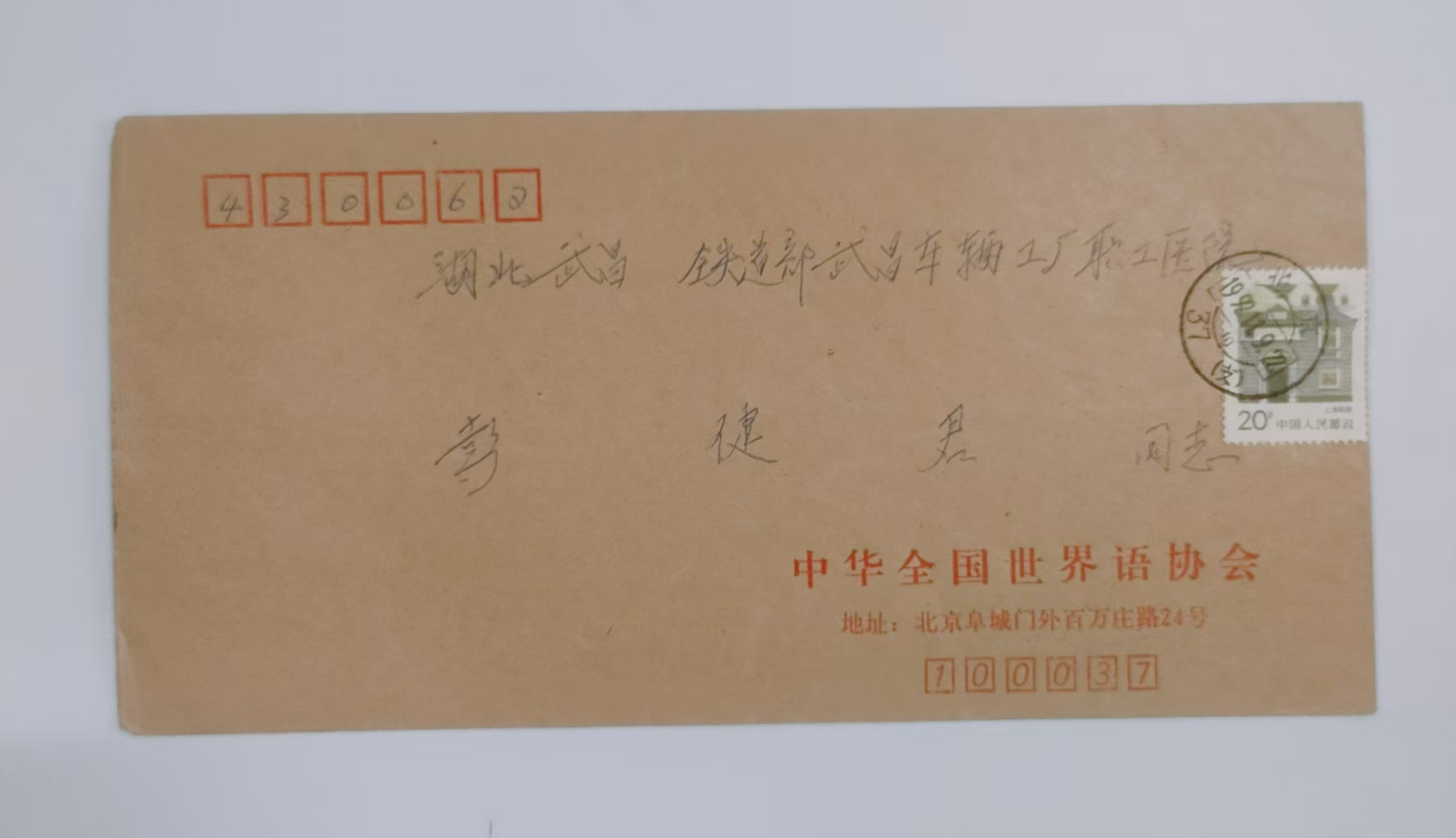 1992年中华全国世界语协会给彭健君邮寄资料的信封