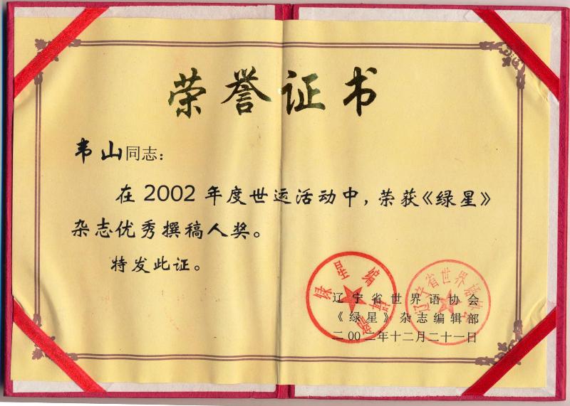 2002年韦山《绿星》优秀撰稿人荣誉证书
