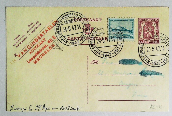 1947年弗兰德曼第12届世界语大会实寄明信片
