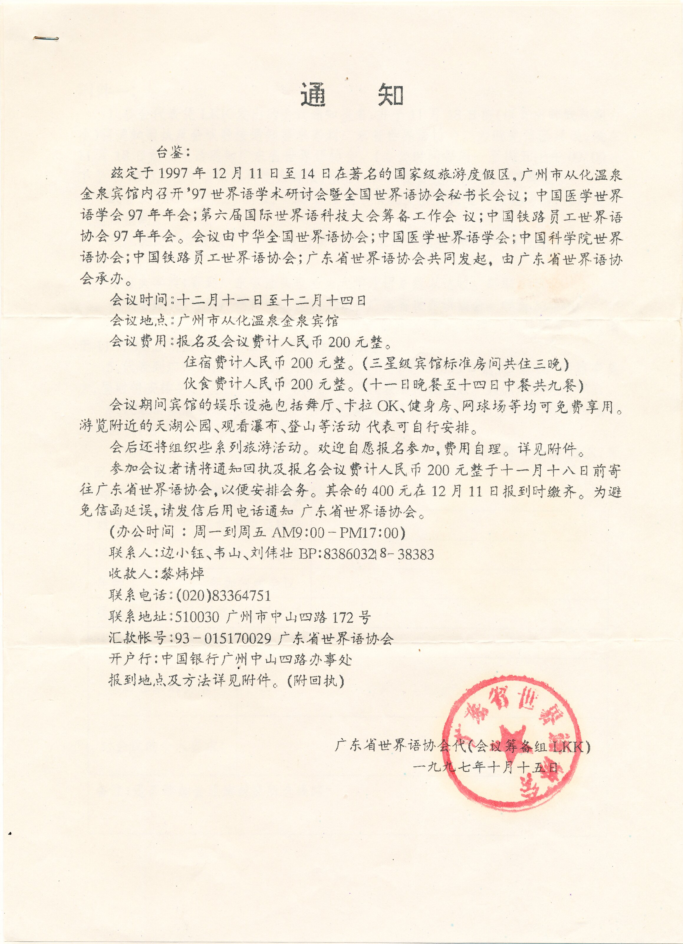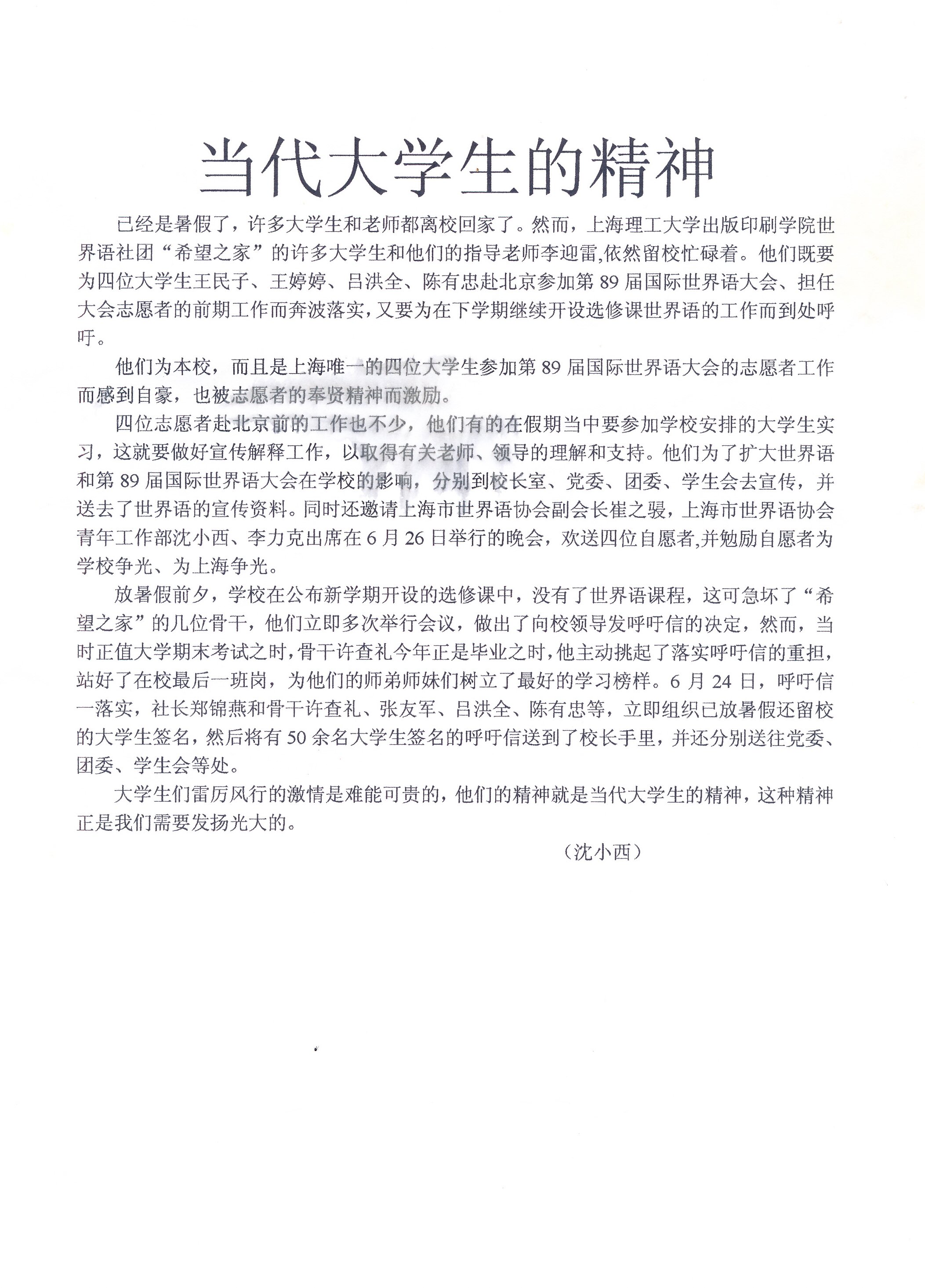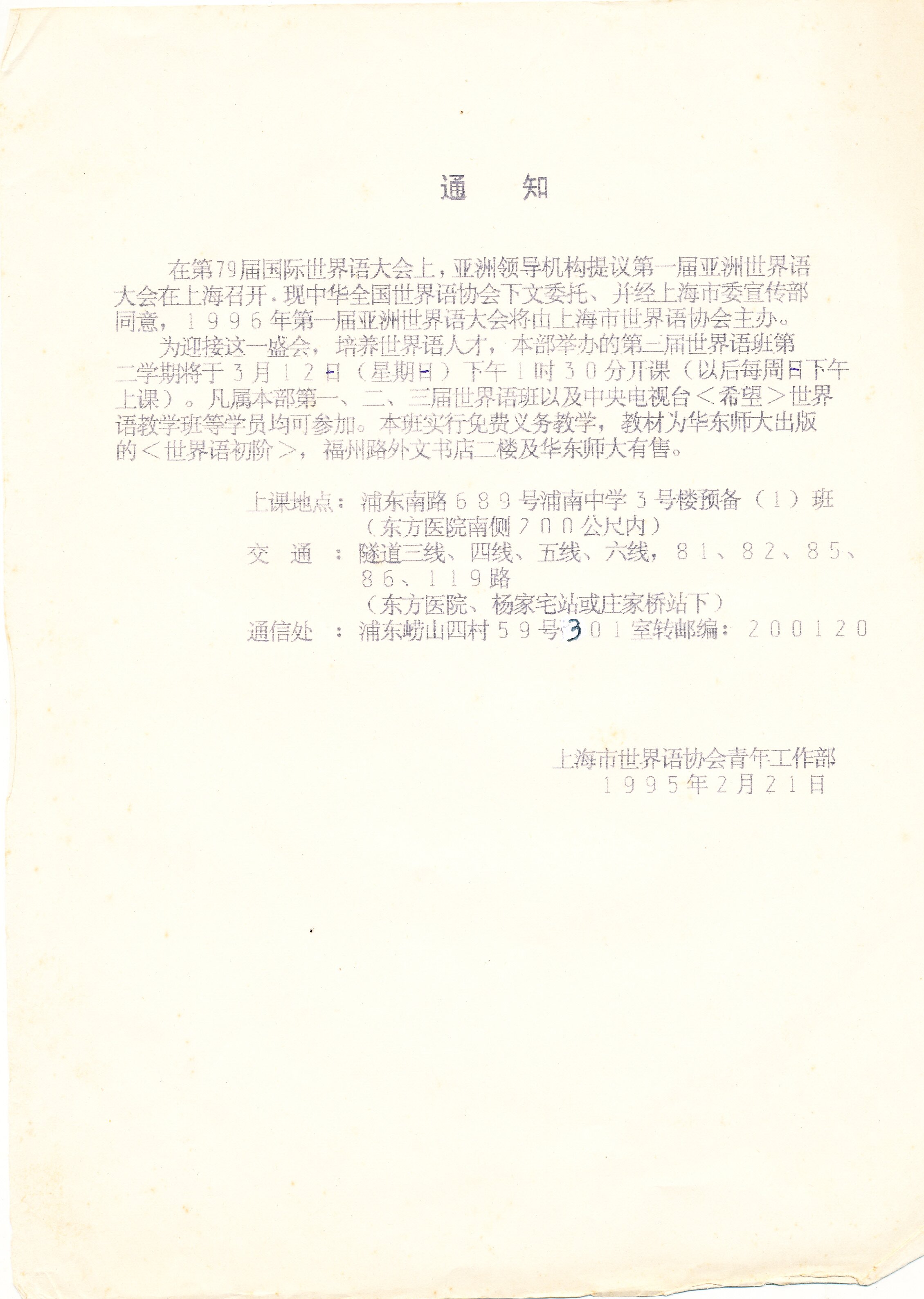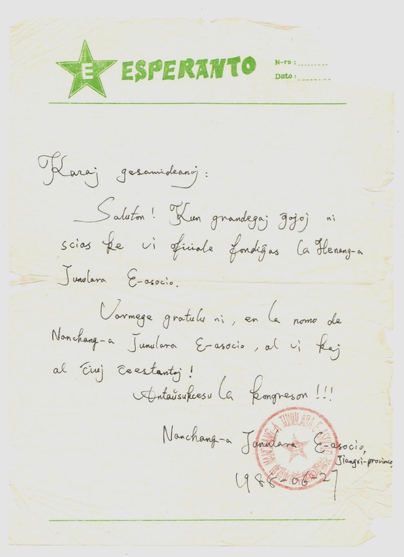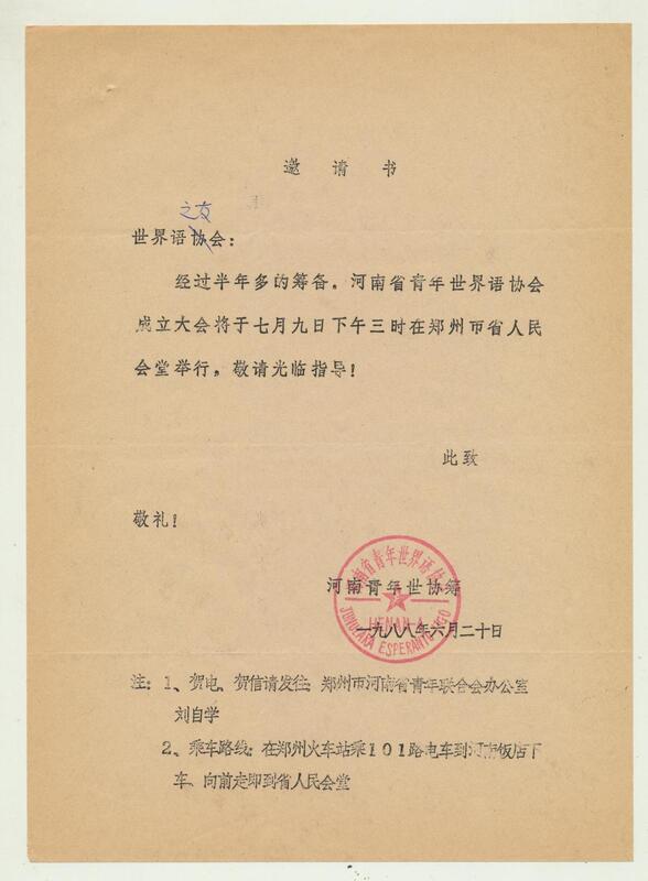1988年6月20日河南省青年世界语协会“关于青年世界语协会成立大会”致世界语之友会的邀请书