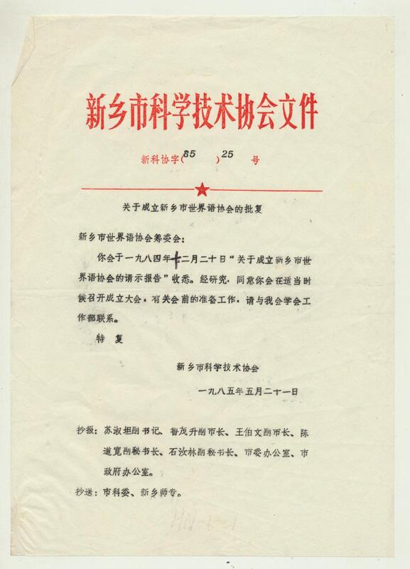 1985年5月21日新乡市科学技术协会“关于成立新乡市世界语协会的批复”