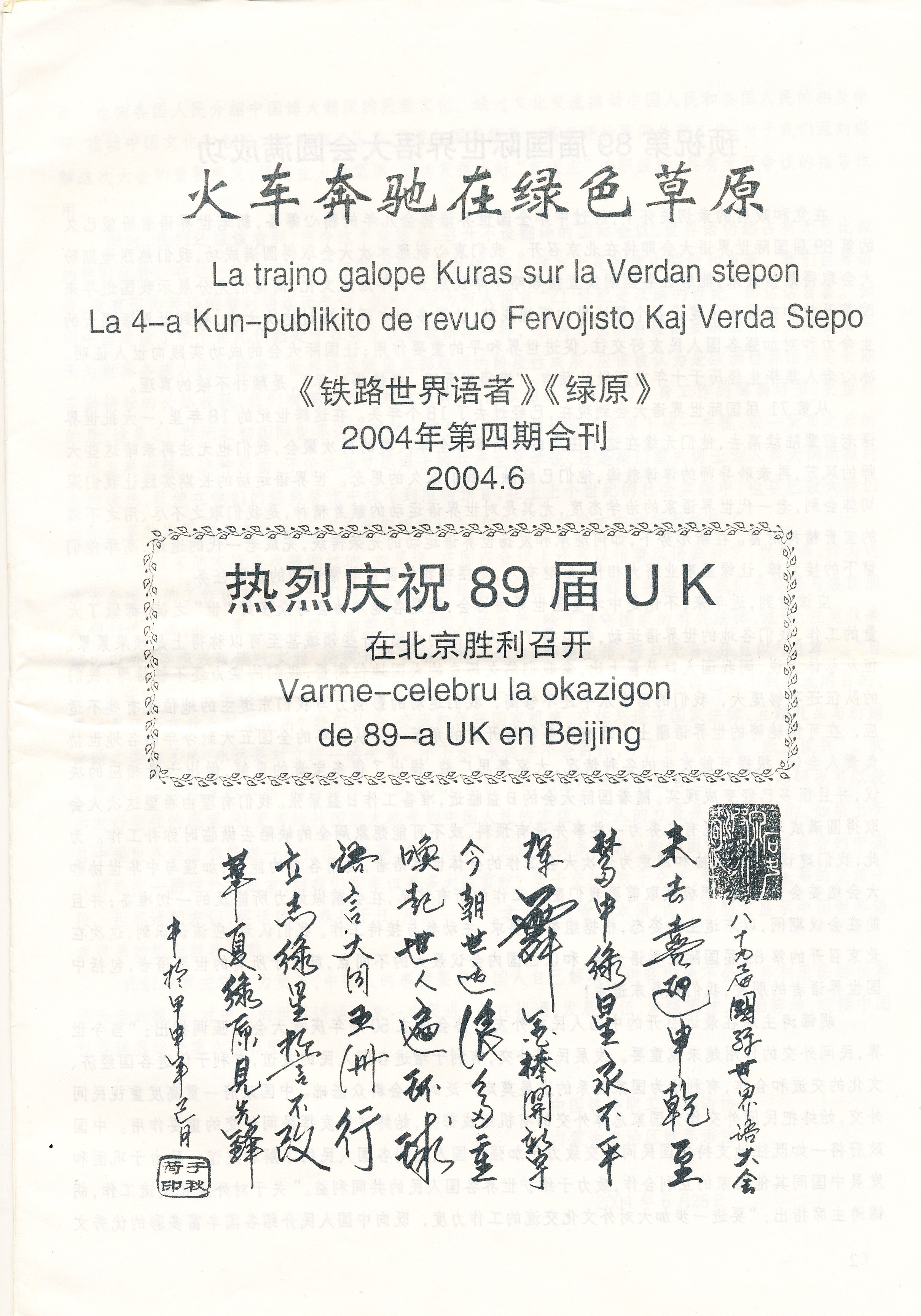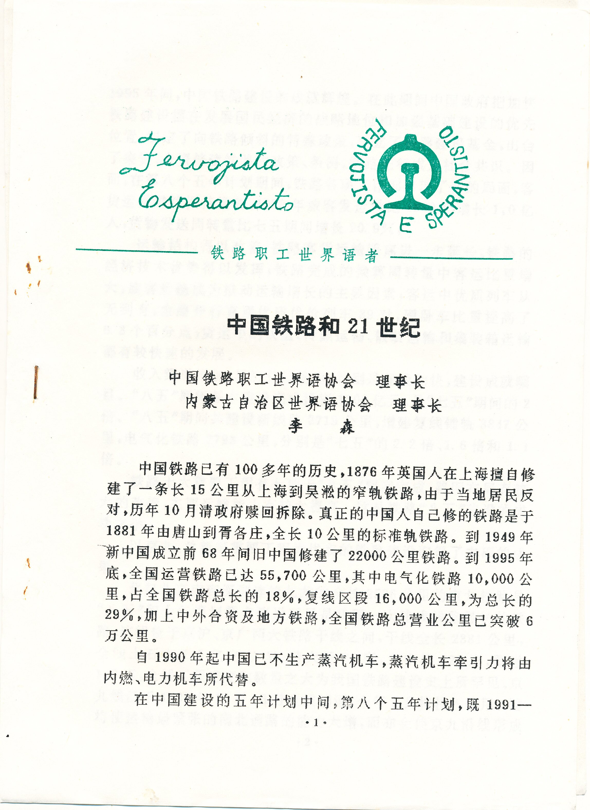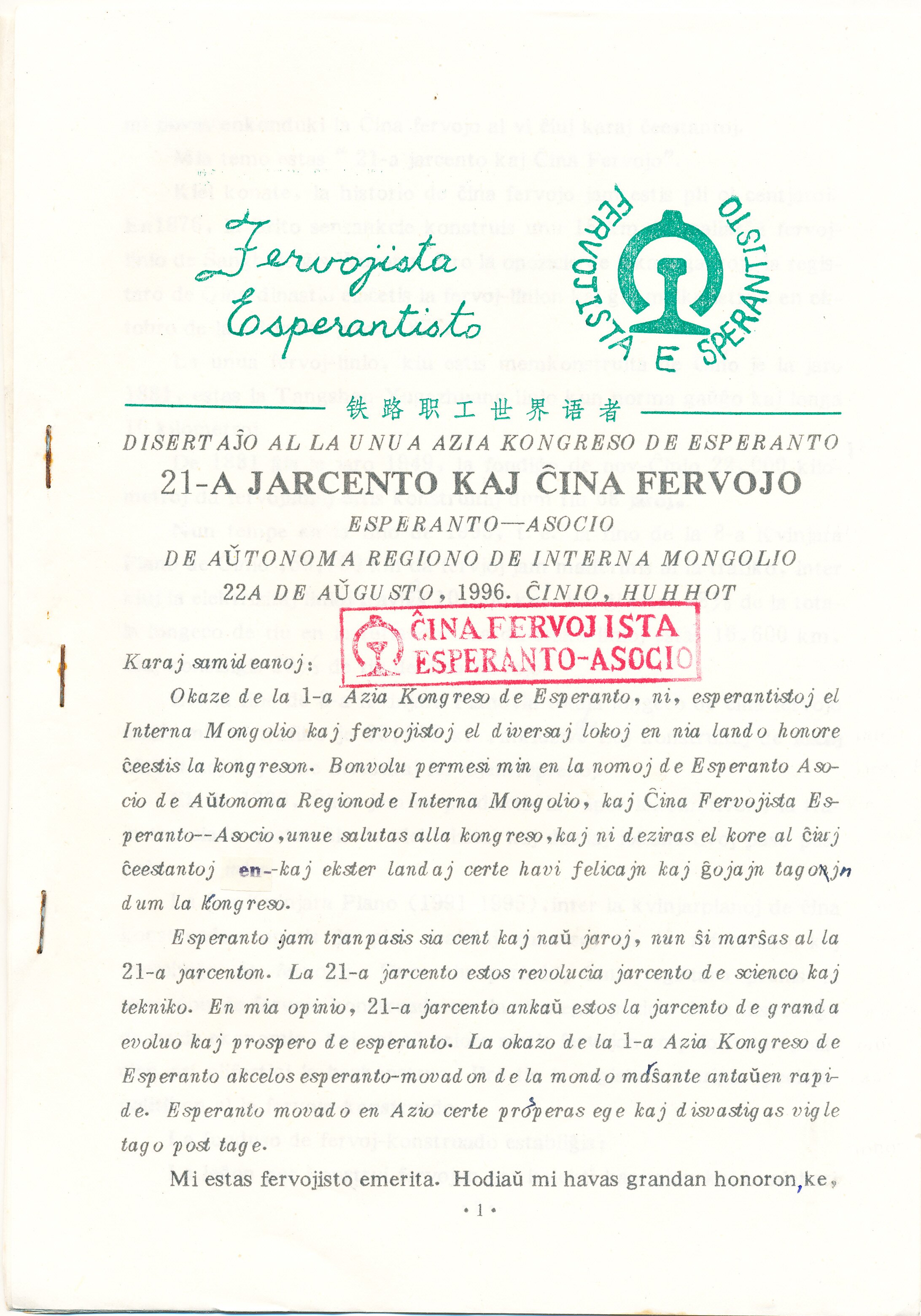 1996年铁路职工世界语者《DISERTAJXO AL LA UNUA AZIA KONGRESO DE ESPERANTO》