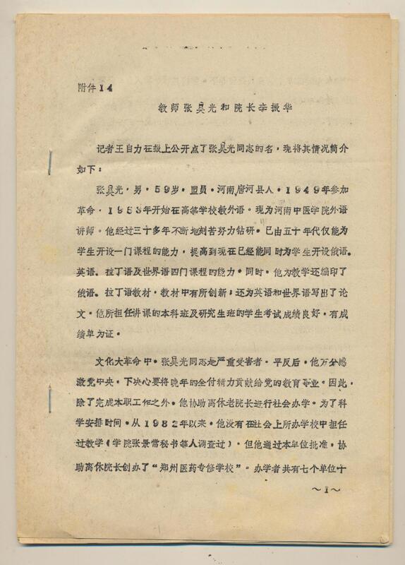 1986年6月24日郑州医药专修学校“关于张昊光协助前院长李振华办学的情况反应”