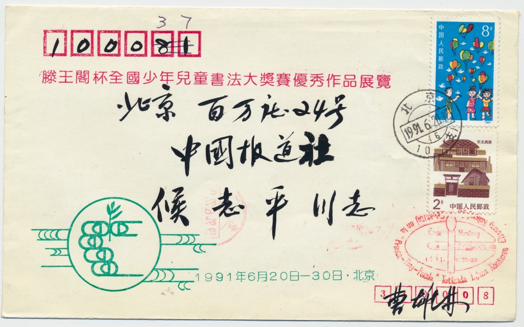 曹雄林寄给侯志平的滕王阁杯全国少儿书法大赛纪念封