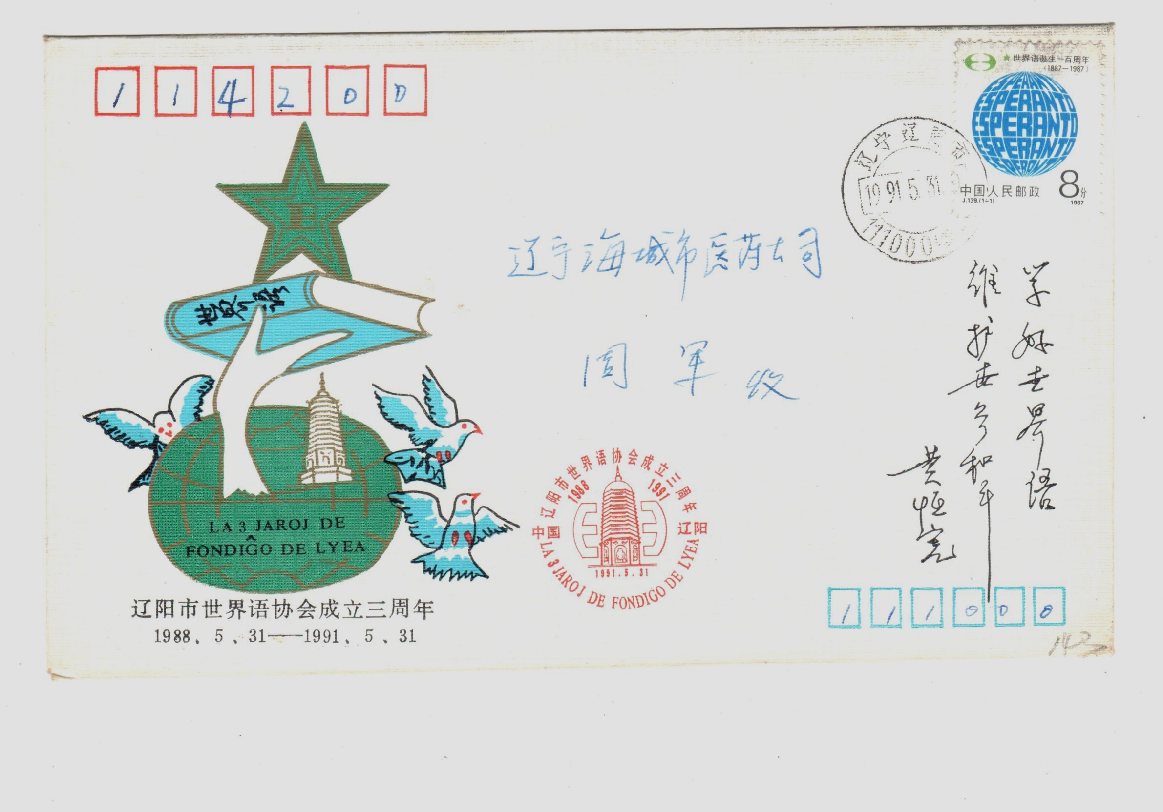 1991年5月31日辽阳市世界语协会成立3周年纪念封