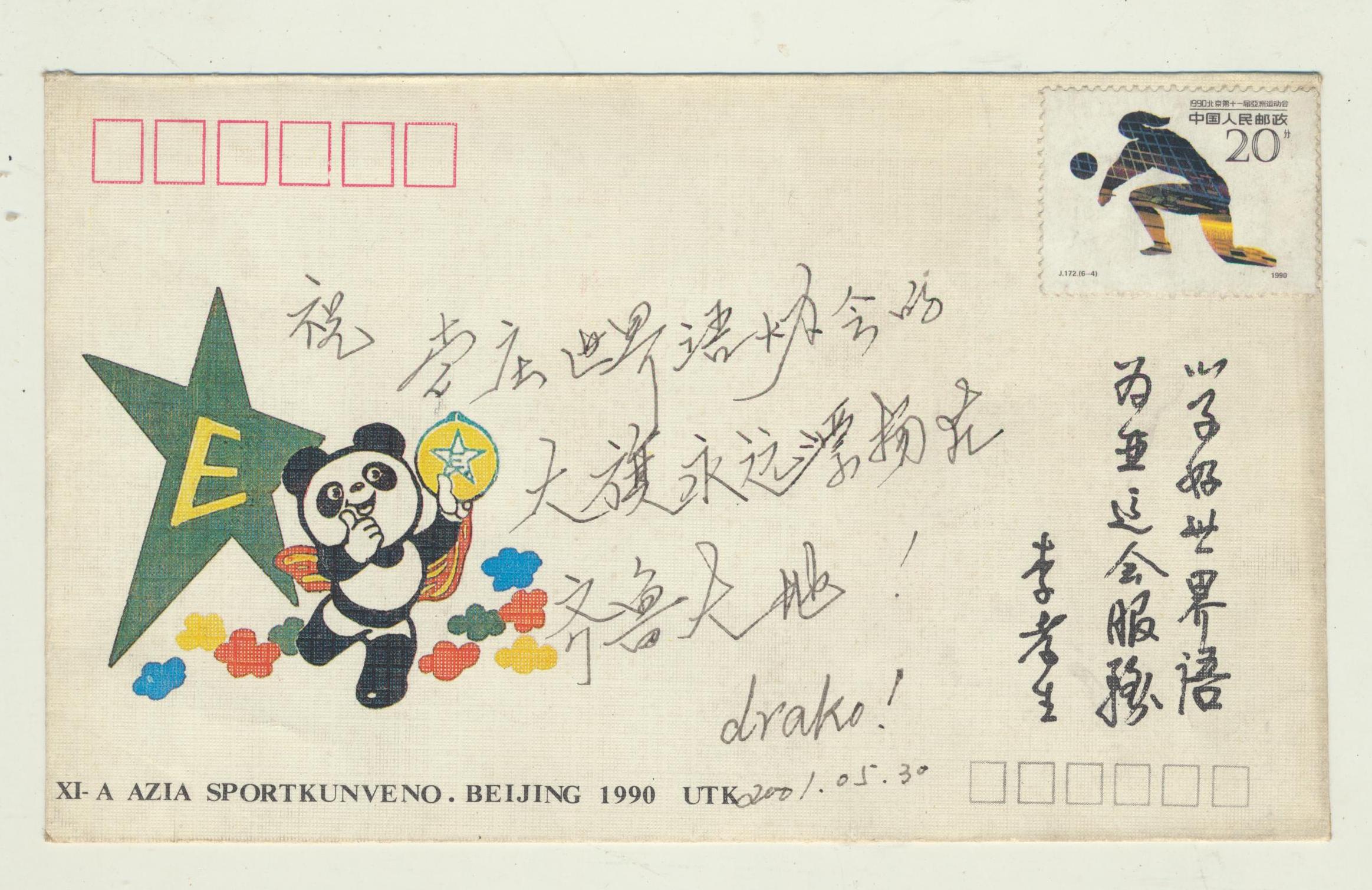 2001年5月30日李良送给枣庄世协的第11届亚运会首日封