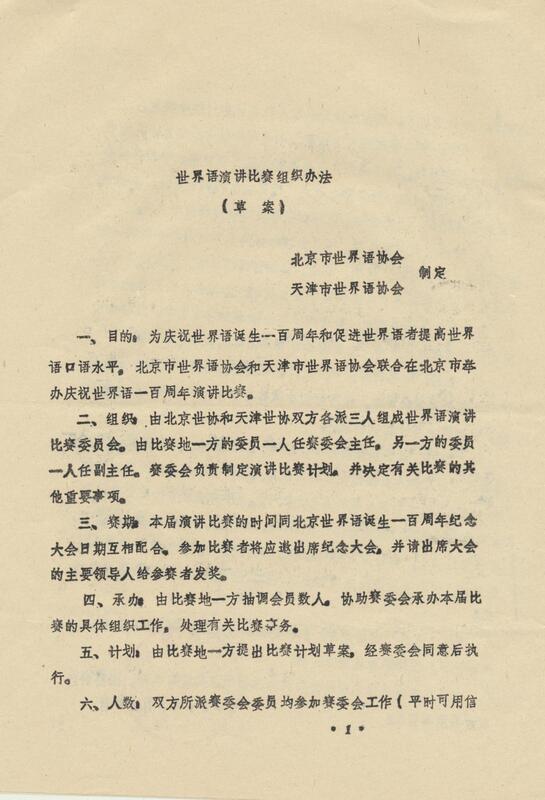 1987年5月17日北京、天津世界语协会世界语演讲比赛组织办法【草案】