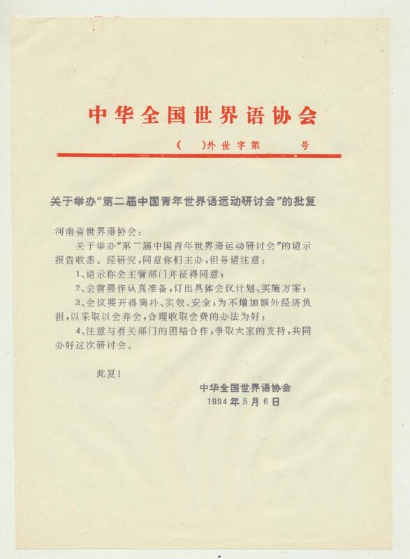 1994年5月6日中华全国世界语协会关于河南省世界语协会举办“第二届中国青年世界语协会研讨会”的批复