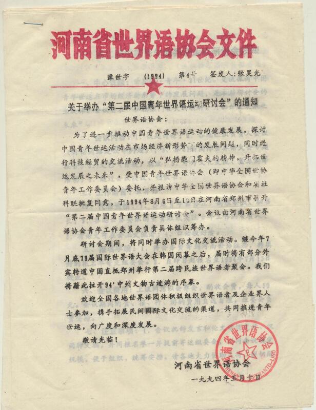 1994年5月10日河南省世界语协会关于举办“第二届中国青年世界语运动研讨会”的通知