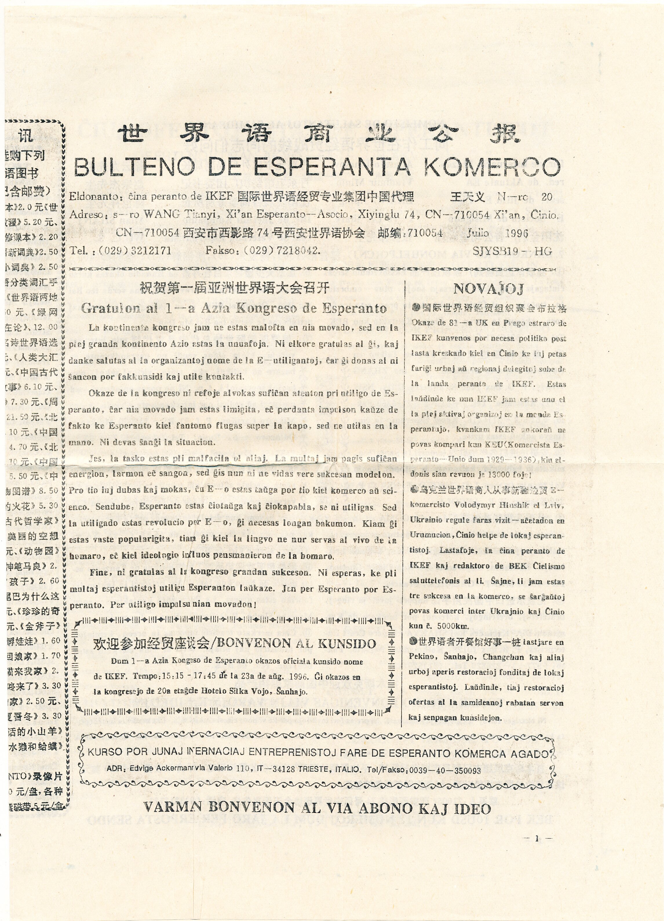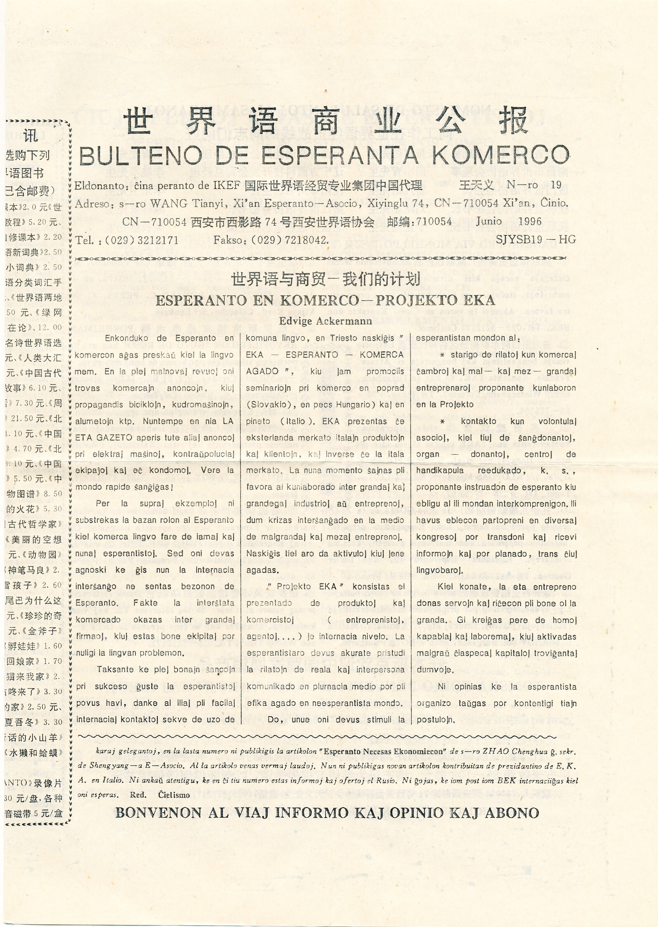 1996年西安《世界语商业公报》第19期