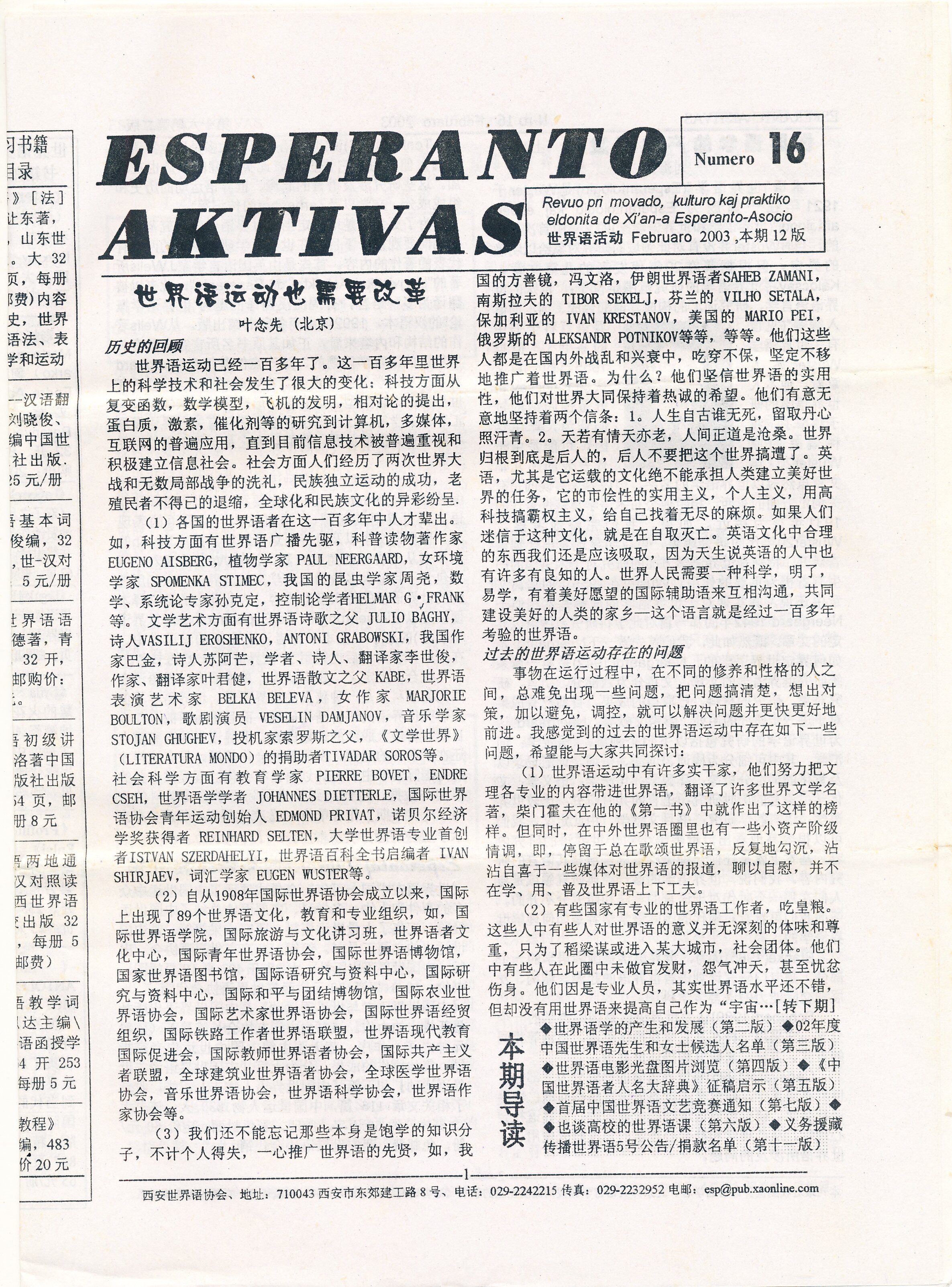 2003年西安《ESPERANTO AKTIVAS》第16期