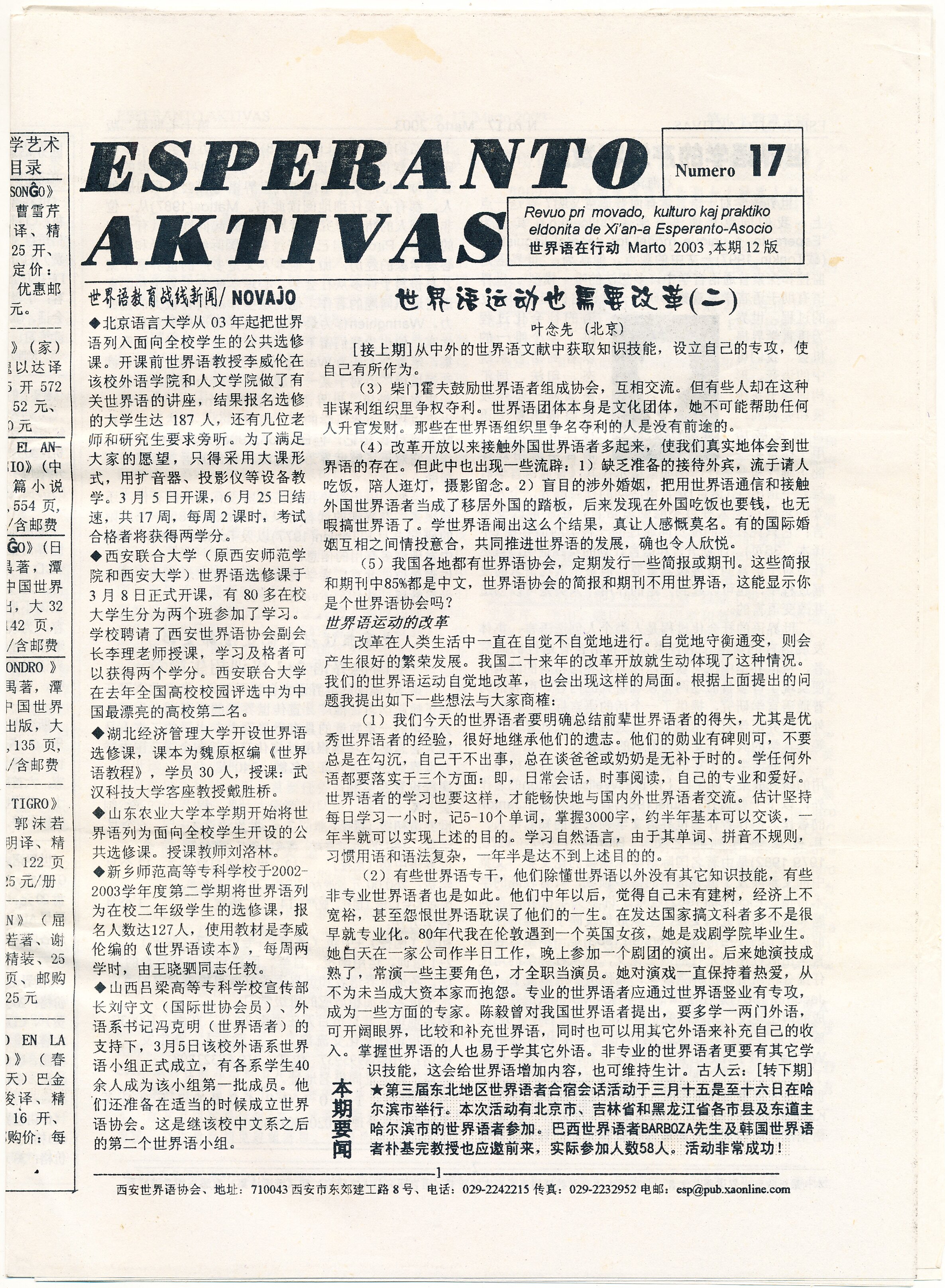 2003年西安《ESPERANTO AKTIVAS》第17期