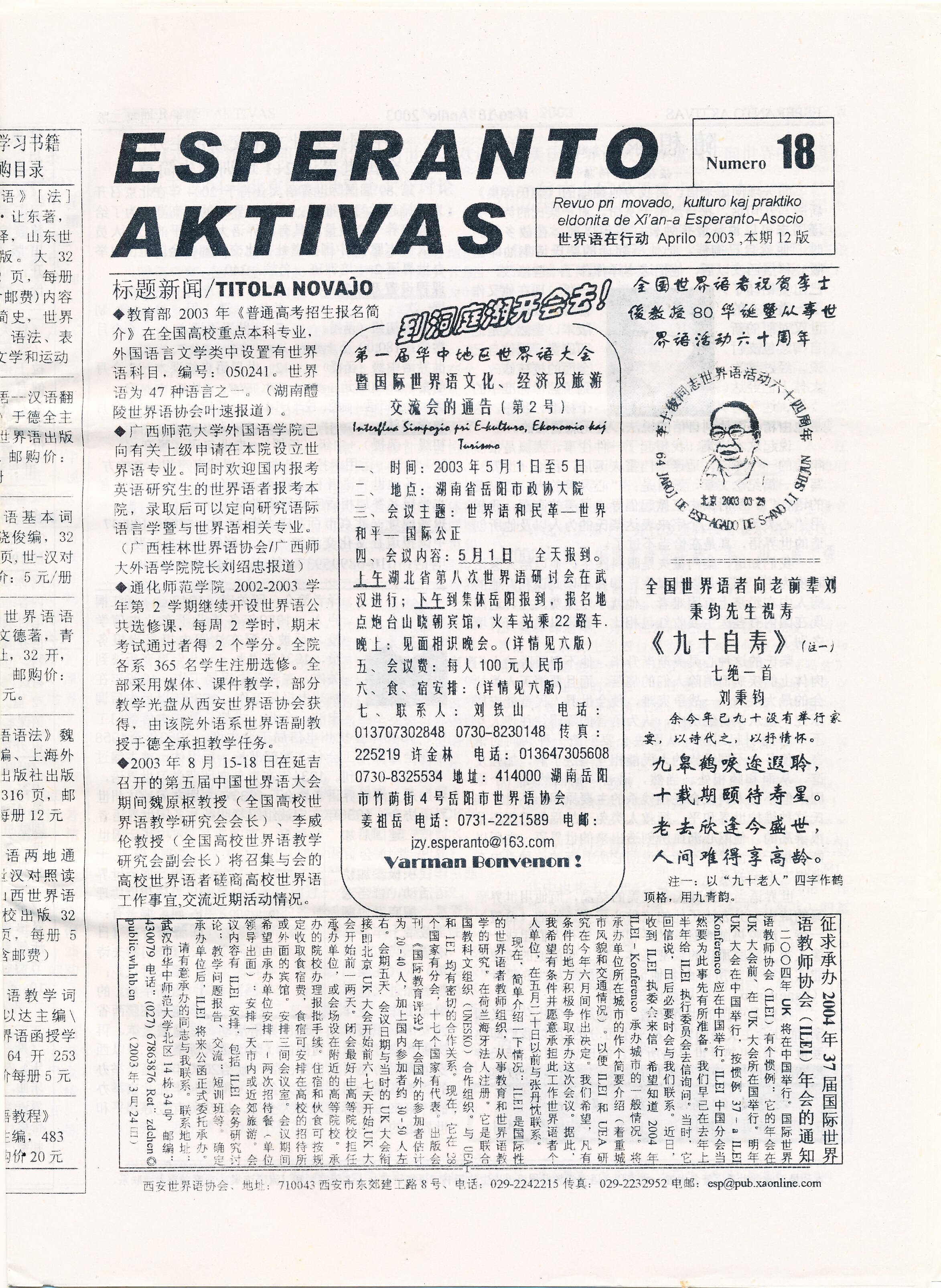 2003年西安《ESPERANTO AKTIVAS》第18期