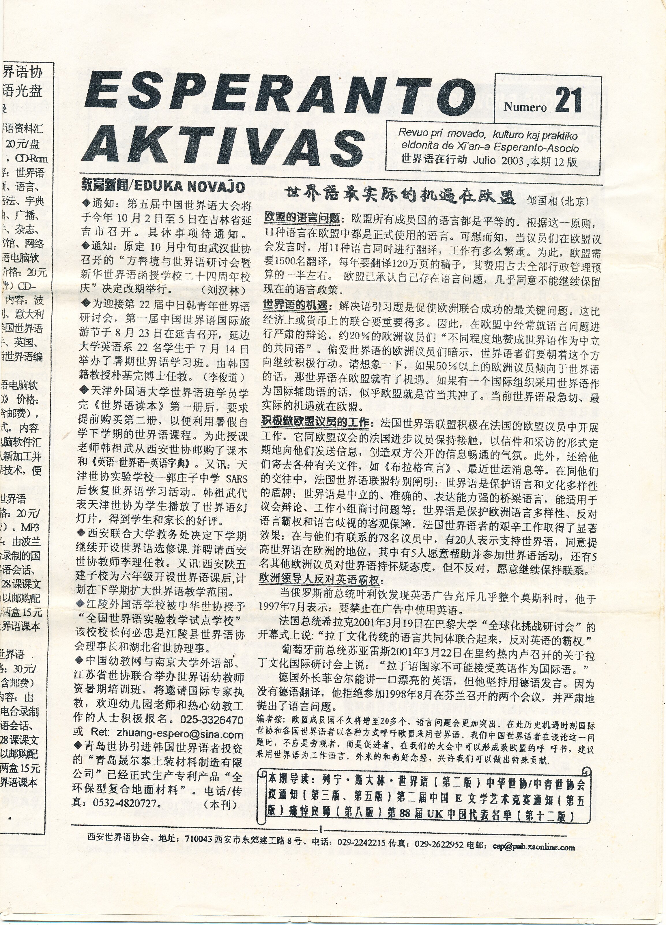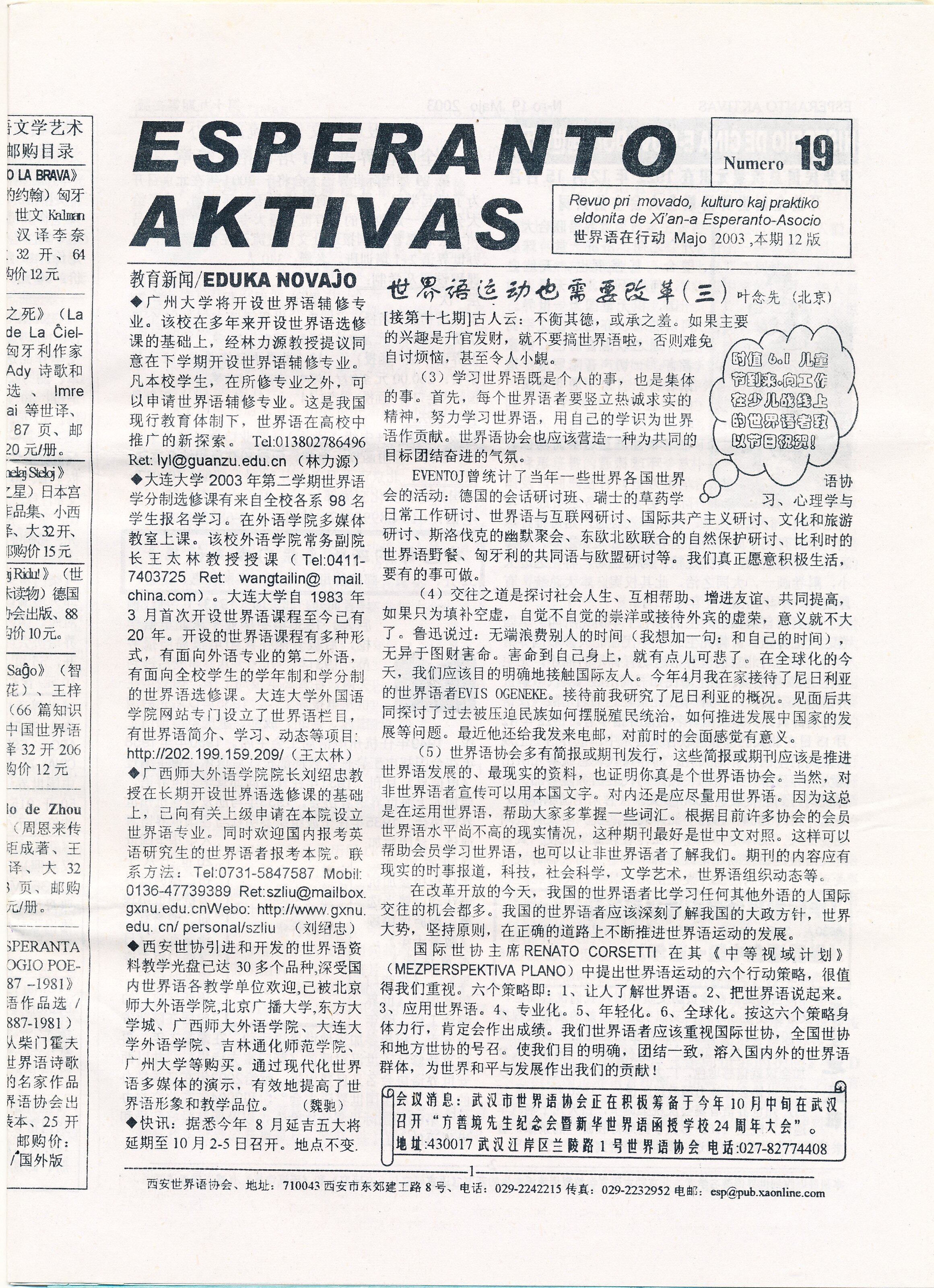 2003年西安《ESPERANTO AKTIVAS》第19期