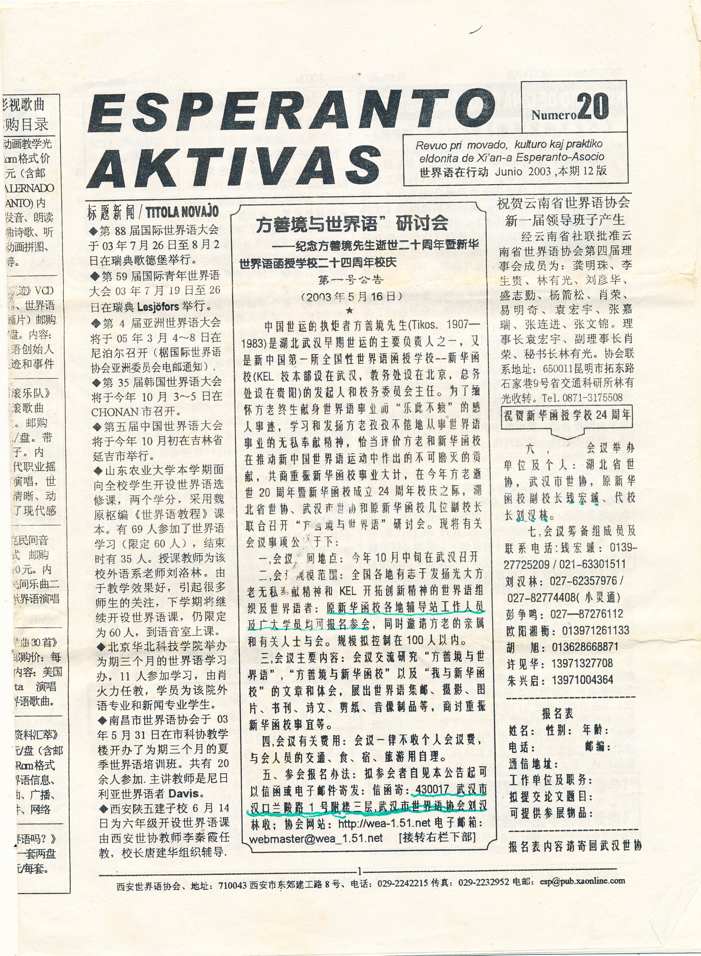 2003年西安《ESPERANTO AKTIVAS》第20期