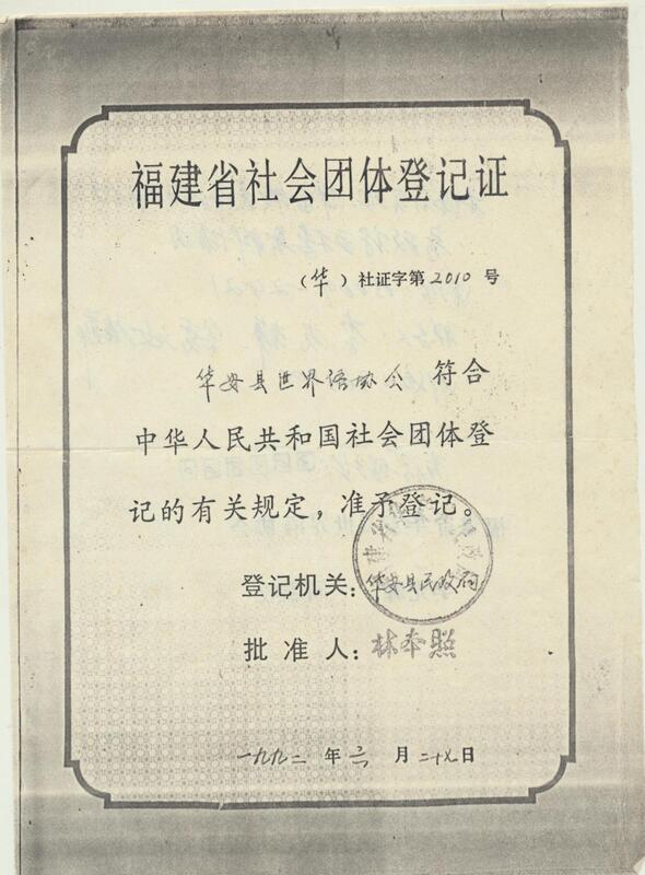 1992年福建华安县世界语协会社会团体登记证 (复印件)