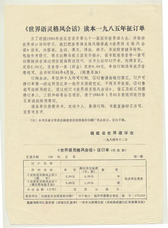 1985年福建省世界语学会《世界语灵格风回话》读本一九八五年征订单