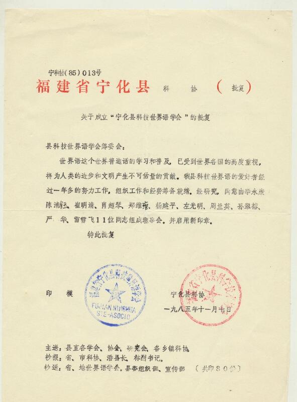 1985年福建省宁化县科协(批复)关于成立“宁化县科技世界语学会”的批复