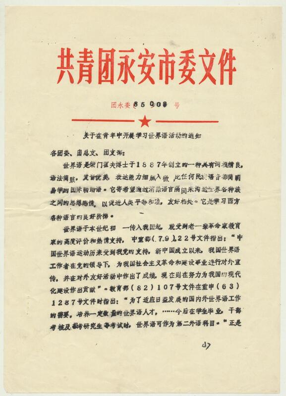1985年福建省共青团永安市市委文件 团永委(85008)号》关于在青年中开展学习世界语活动的通知