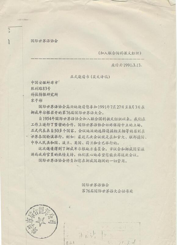 1991年3月13日宋子彬国际世界语协会正式邀请书(译文)