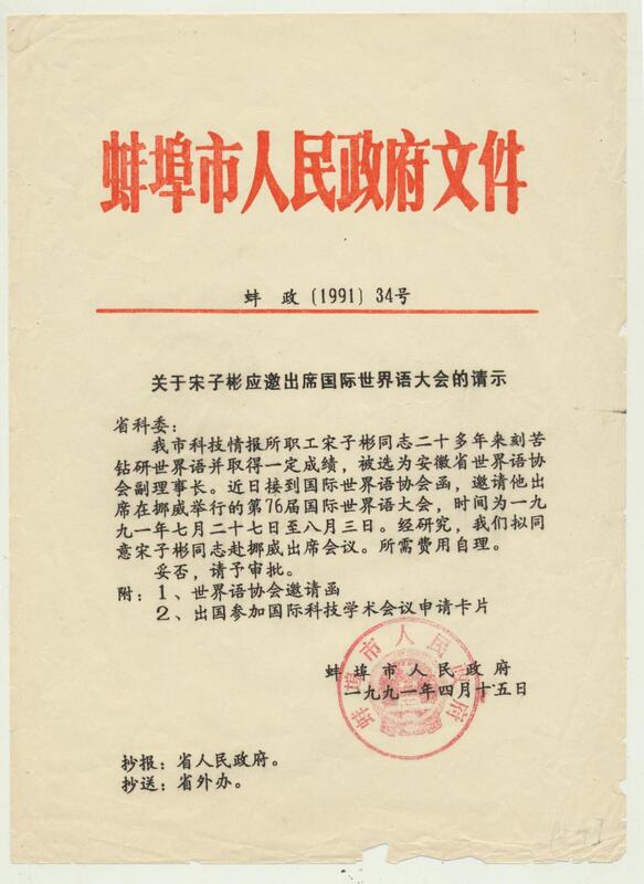 1991年4月15日蚌埠市人民政府关于宋子彬应邀出席国际世界语大会的请示