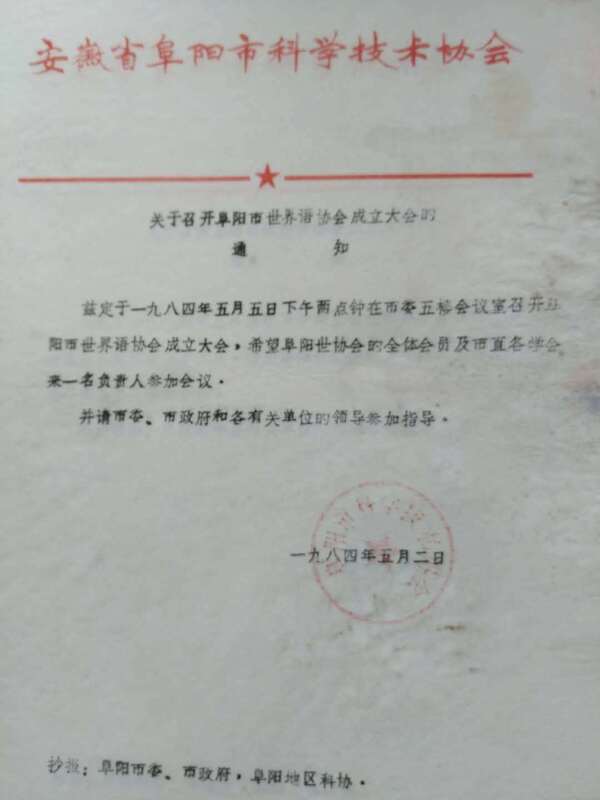 1984年阜阳市科协关于召开阜阳市世界语协会成立大会的通知