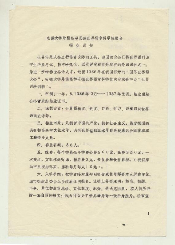 1986年 安徽大学外语系与安徽世界语专科学校联合招生通知