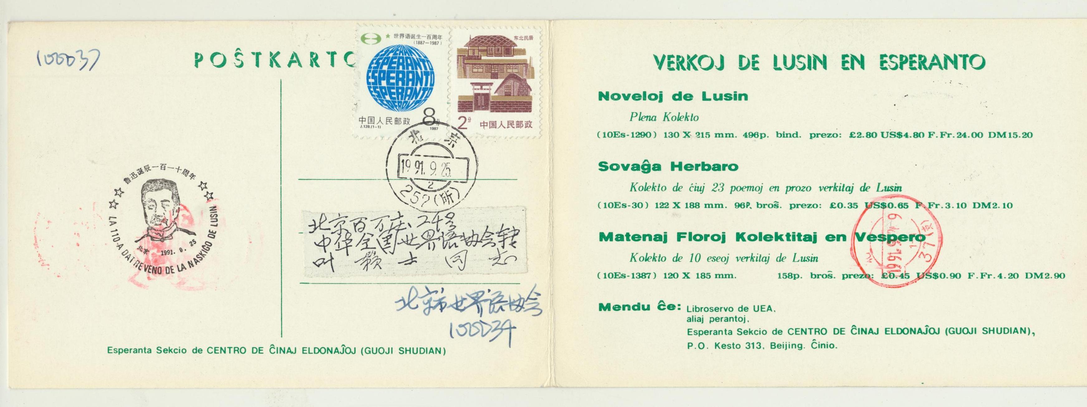 1991年9月25日北京市世界语协会寄给叶籁士鲁迅明信片