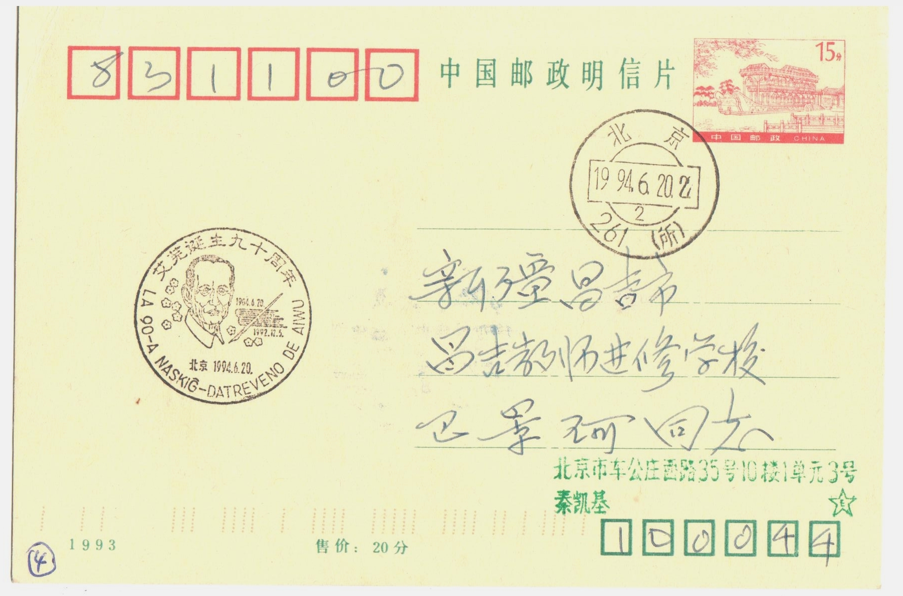 1994年6月20日秦凯基寄给巴景珂艾芜诞生90周年纪念戳明信片