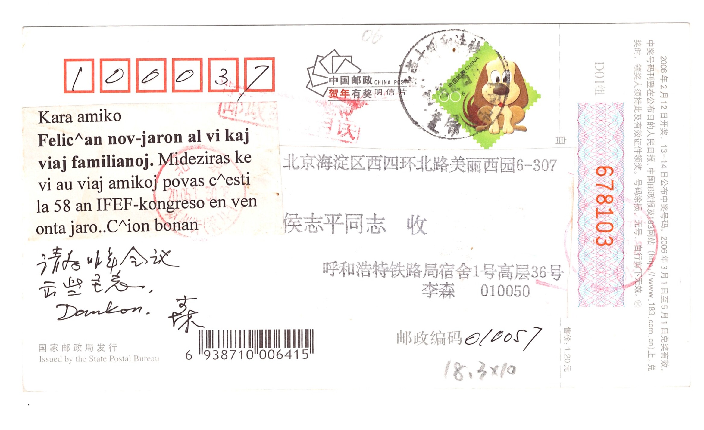 2007年福州世界语学校寄给北京国际广播电台世界语部有奖明信片