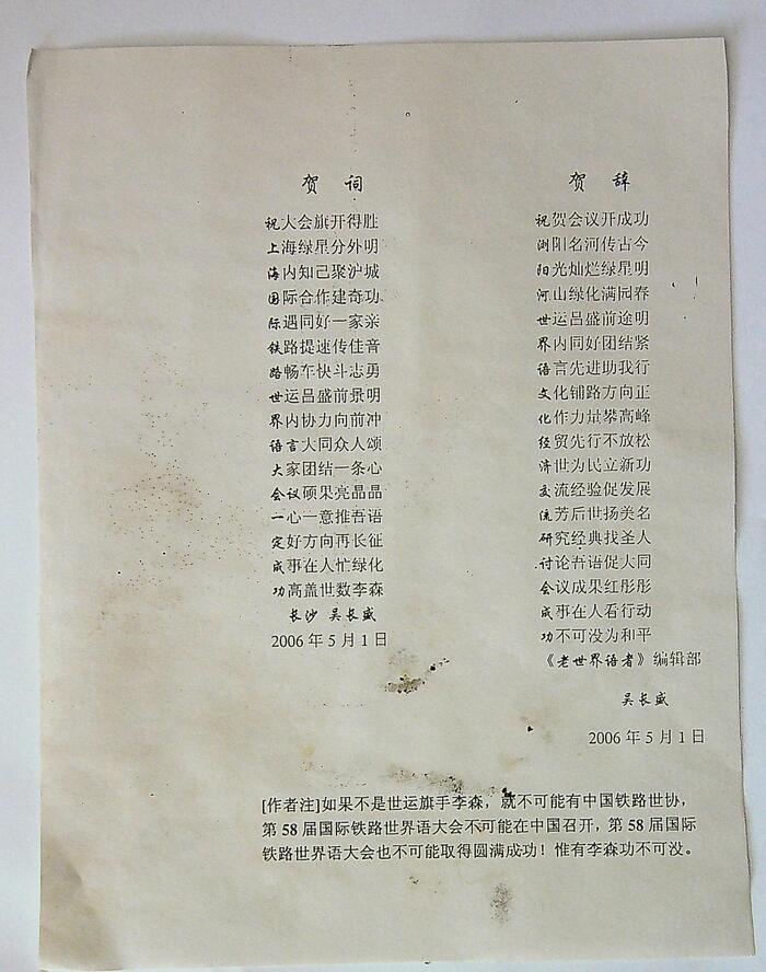 2006年吴长盛国际铁路世界语大会藏头诗