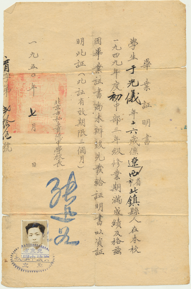 1950年7月于光义中学毕业证书