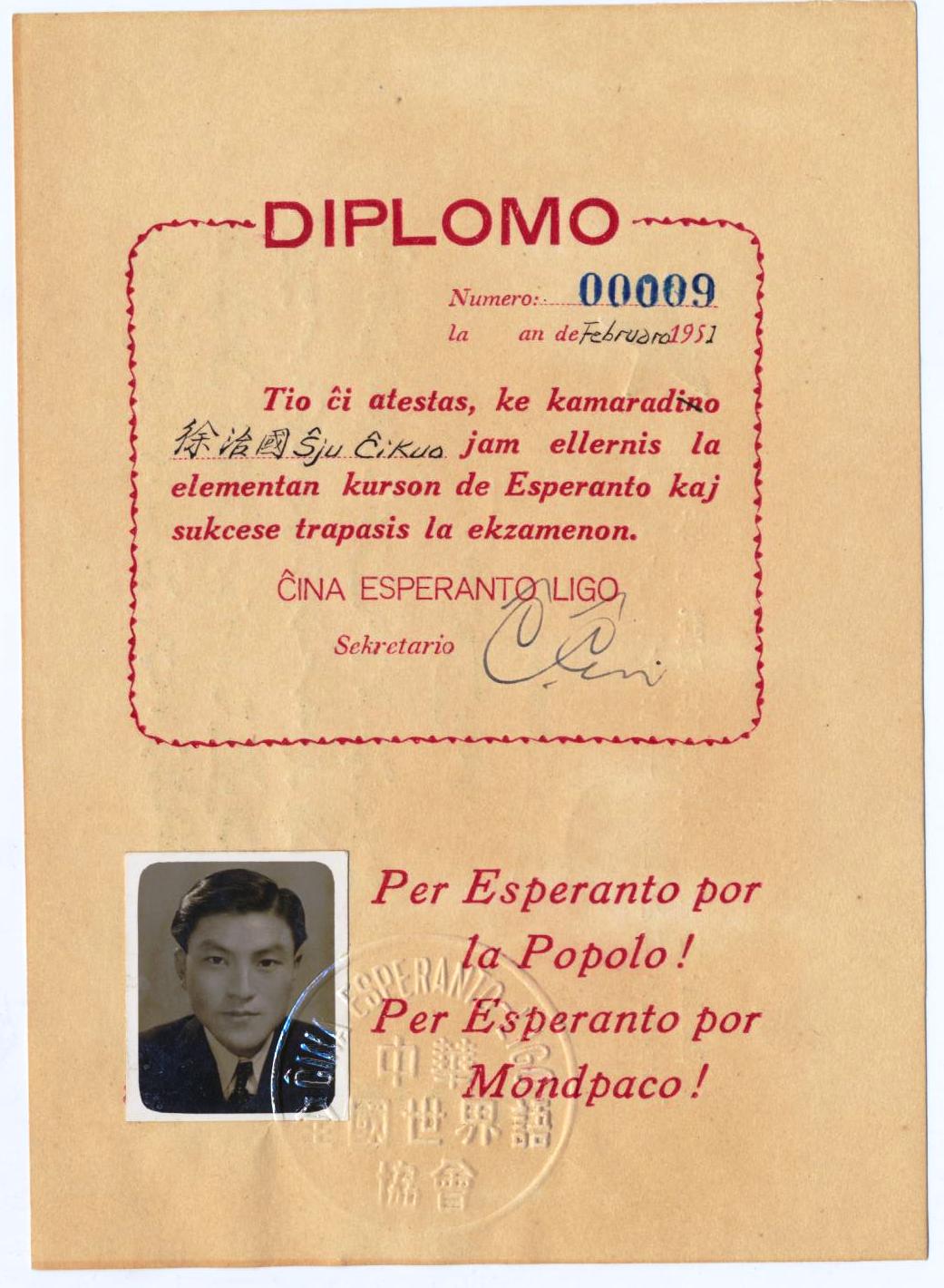 1951年2月徐治国中华全国世界语协会培训班结业证