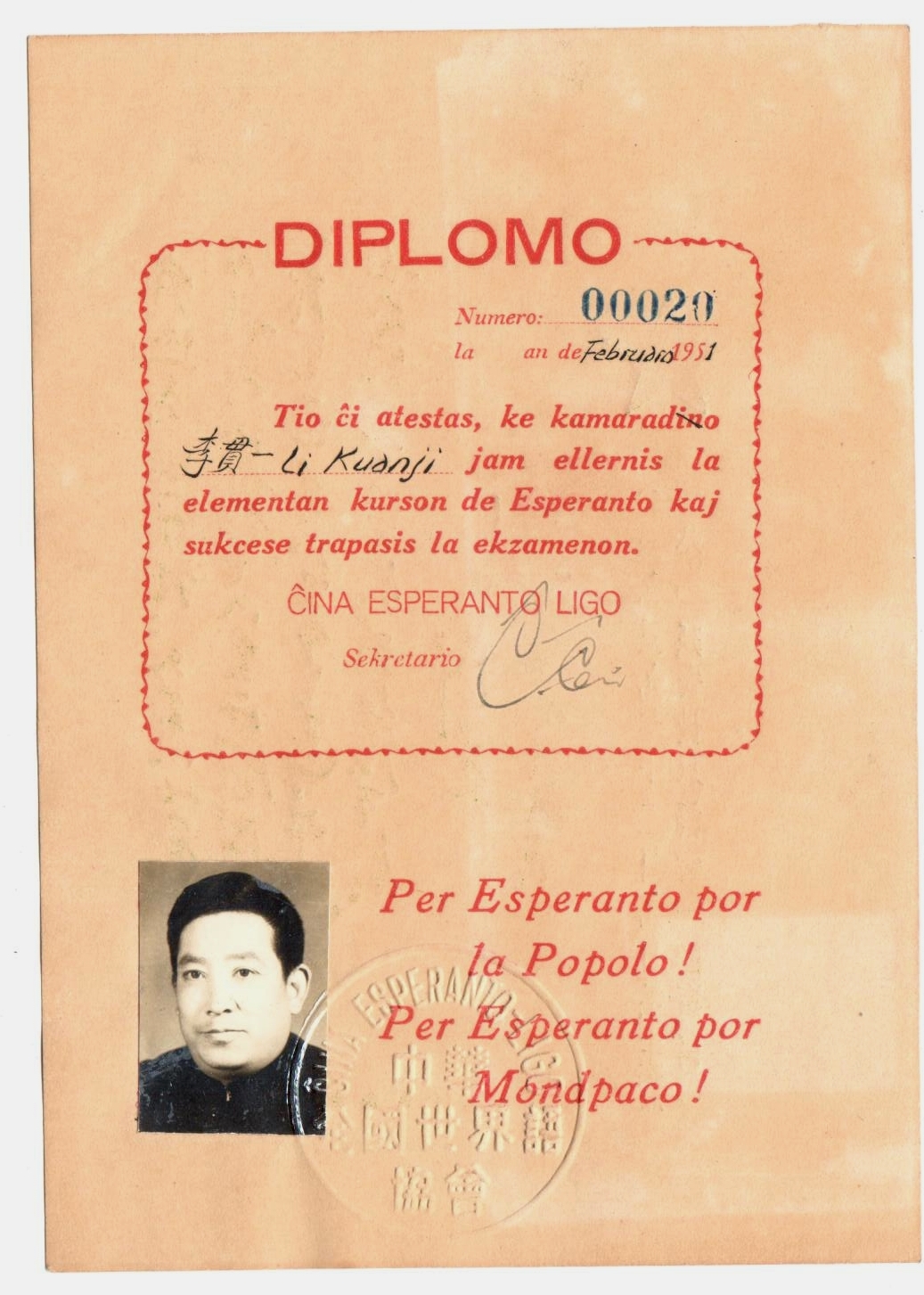 1951年2月李贵一中华全国世界语协会培训班结业证