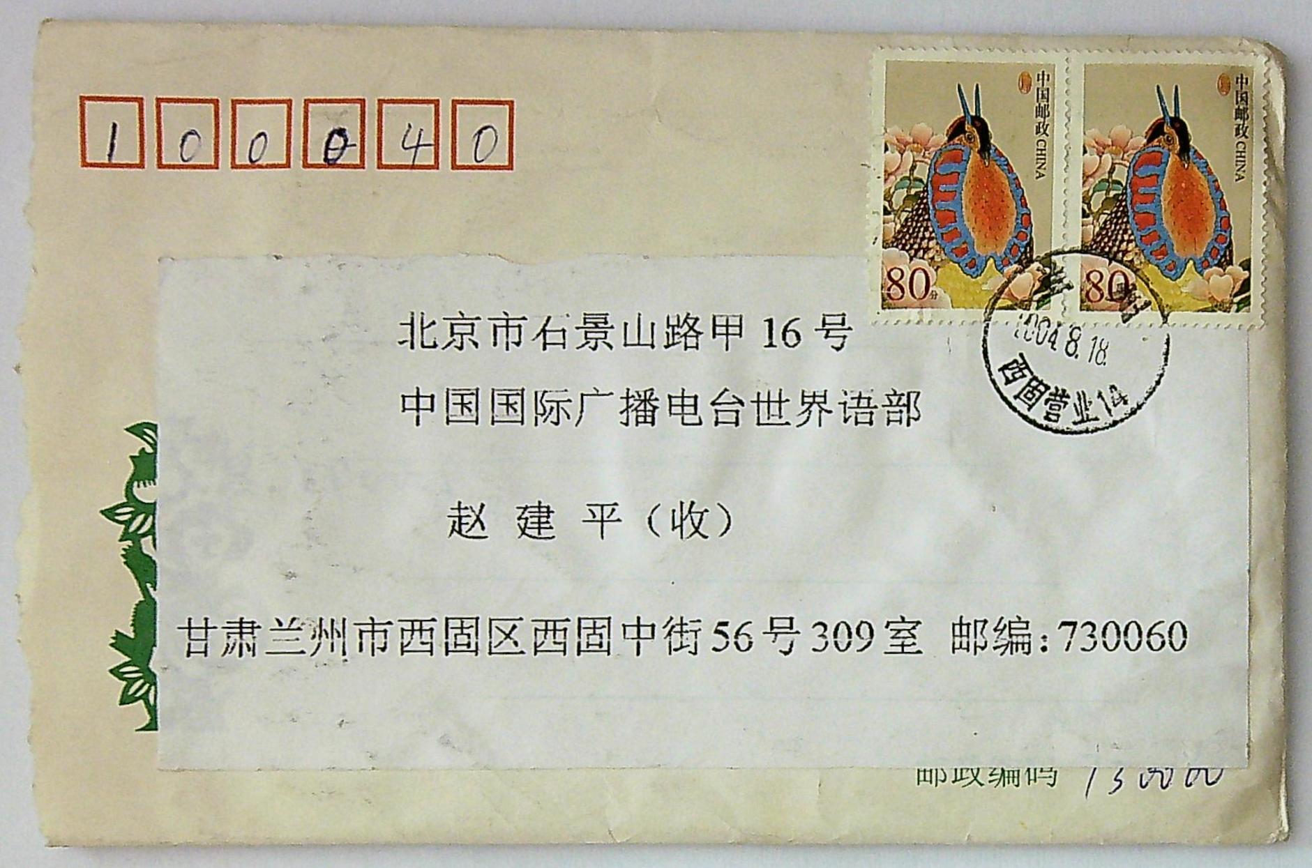2004年8月18日兰州某人给赵建平写信的信封