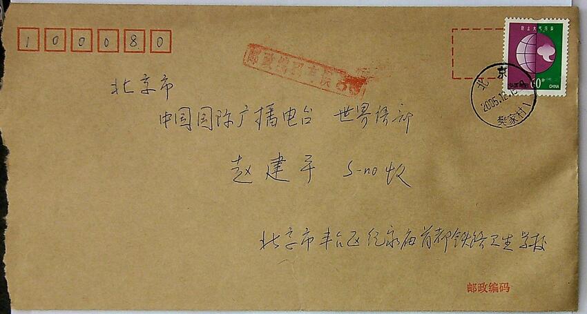 2005年12月13日北京某人致信赵建平的信封