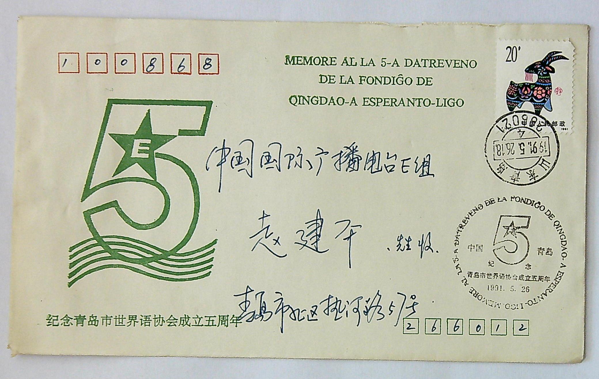 1991年5月26日青岛市世界语协会成立五周年纪念封