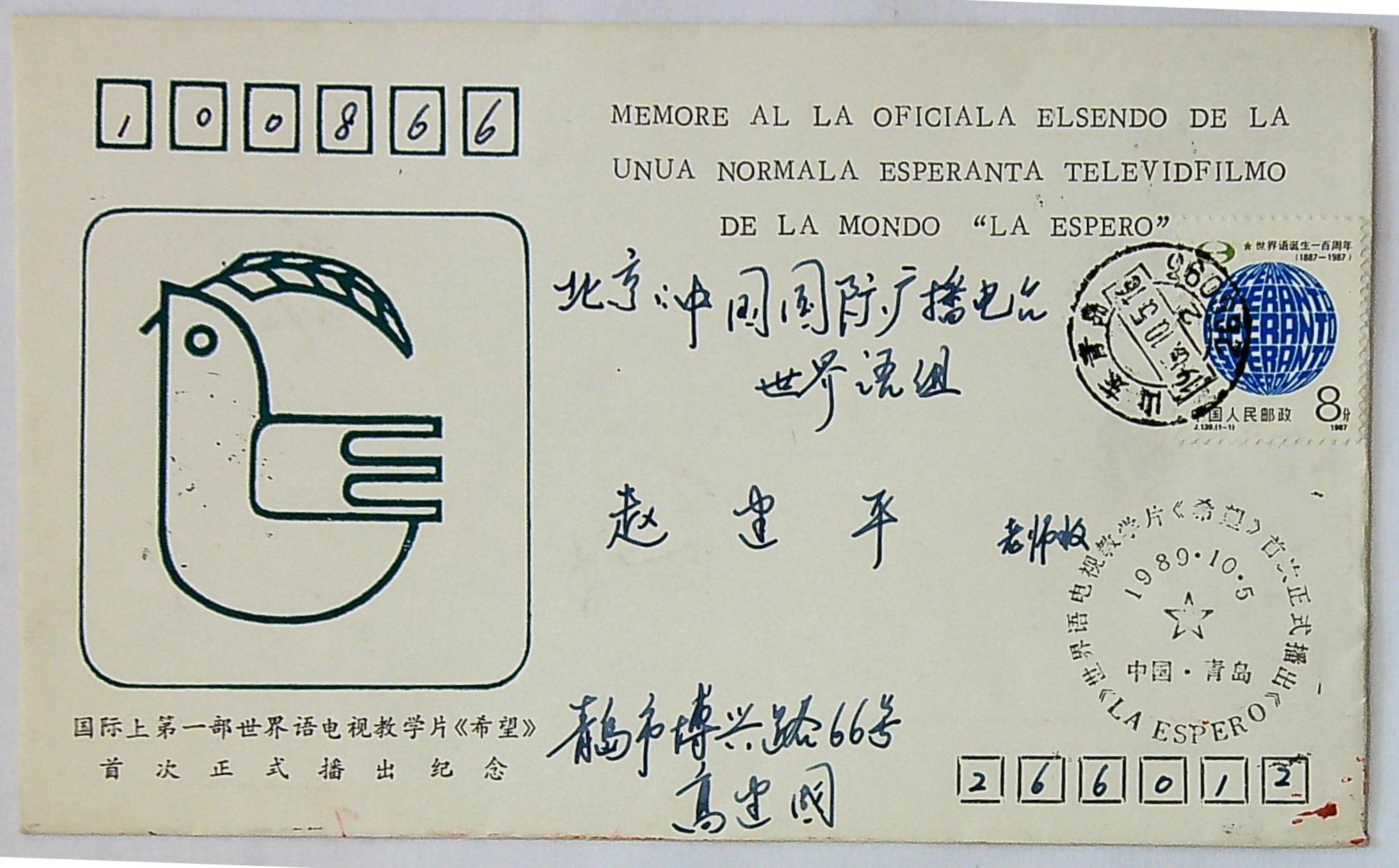 1989年10月5日高建国寄给赵建平世界语希望电视教学片首次正式播出纪念封